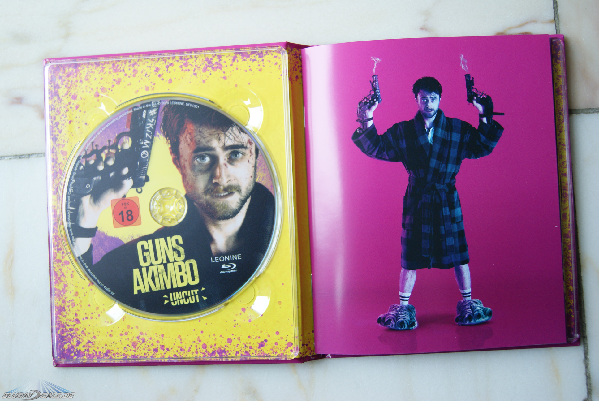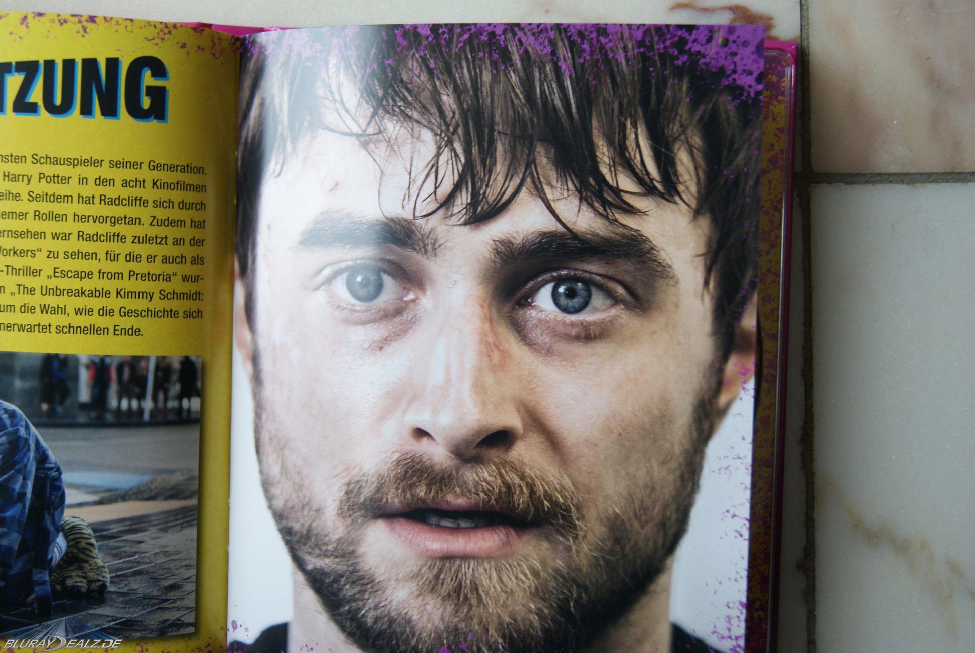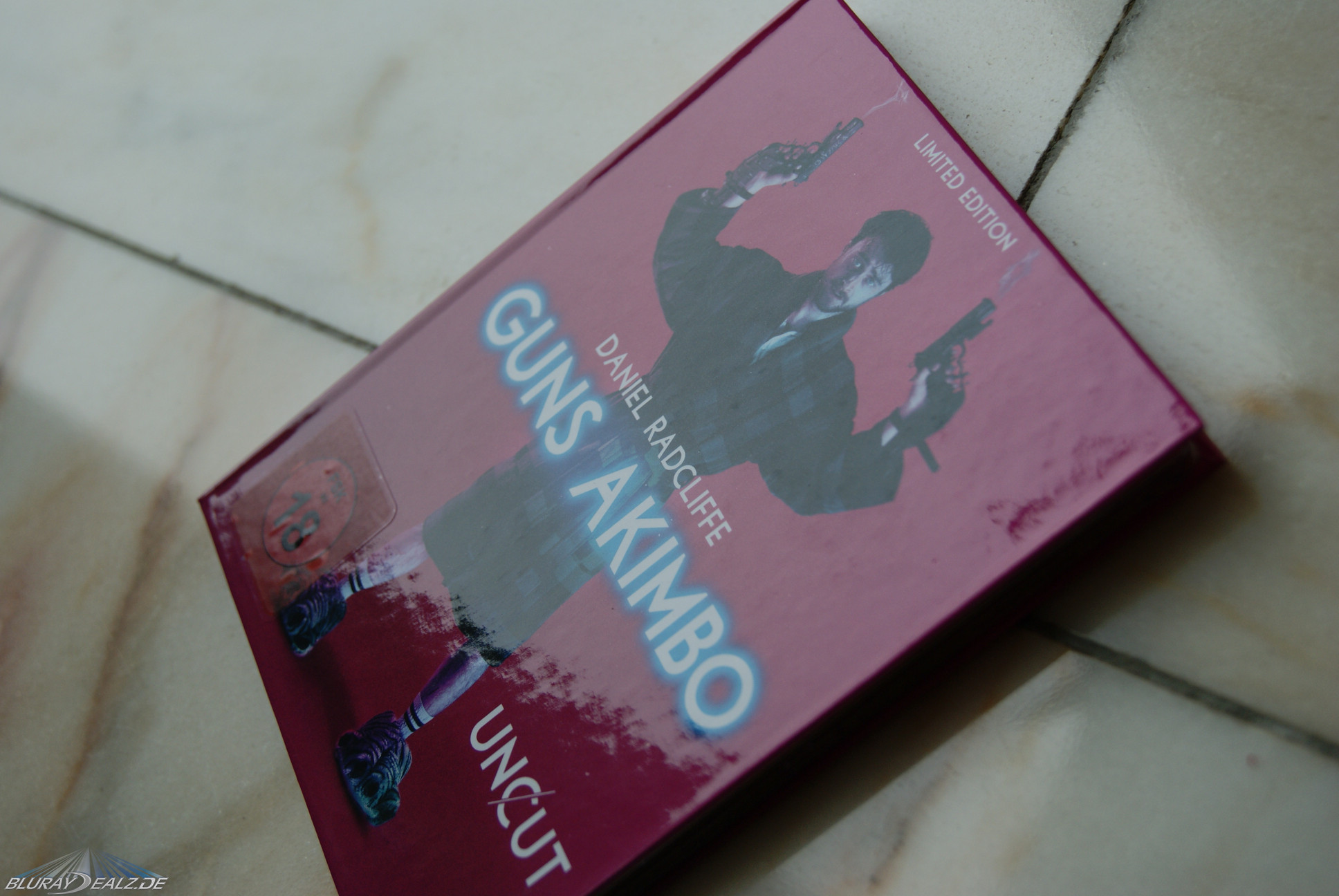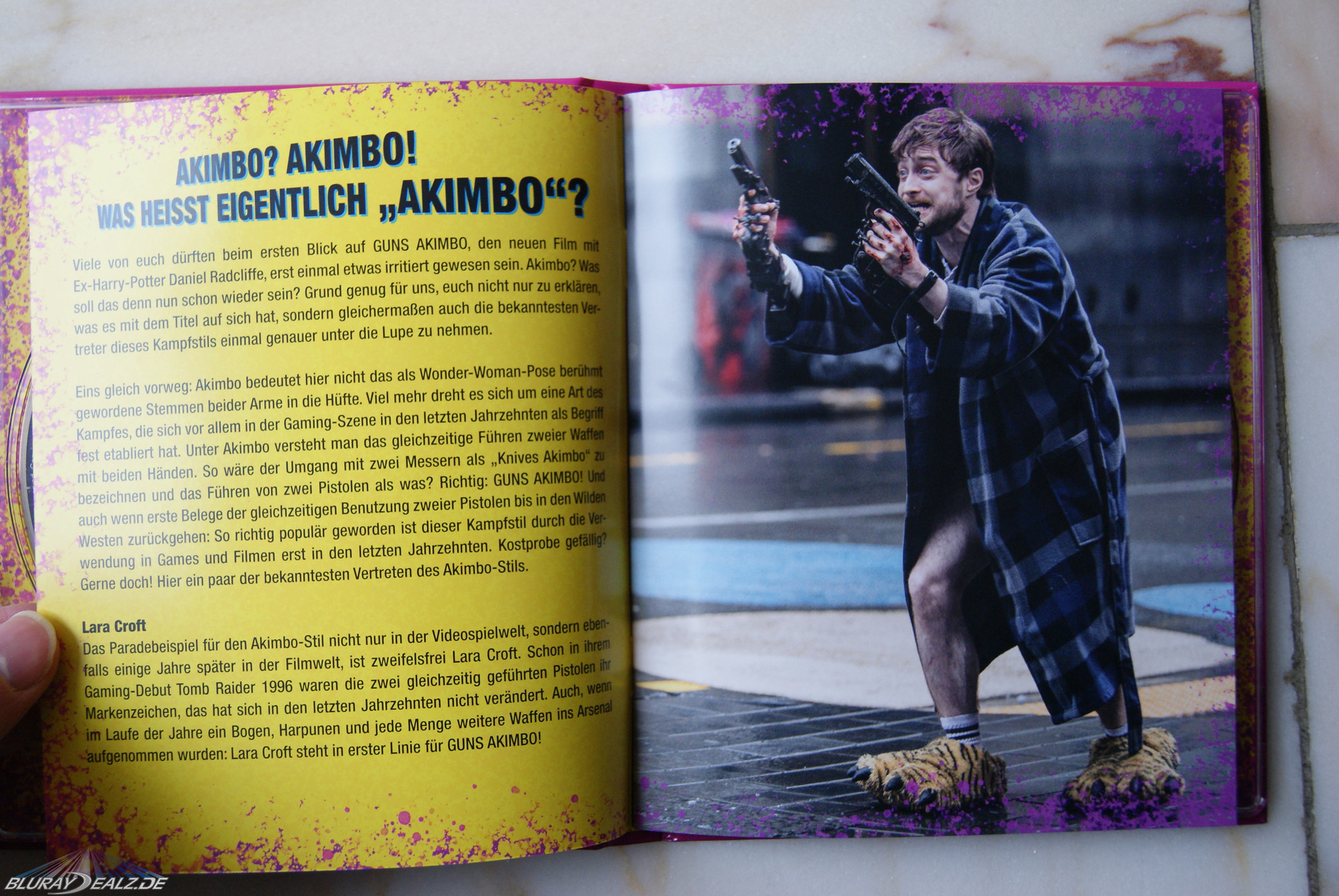 Das Mediabook ist mit 24 Seiten immer noch dick, aber 4 Seiten schmaler als bei der letzten VÖ. Es enthält einen langen Text in vernünftiger Schriftgröße und sehr viele teilweise enorm tollen Bilder (Daniel Radcliffe !). Der Text erklärt nochmal den Begriff „Akimbo“ und geht auf Charaktere ein, die diese Position berühmt gemacht haben. Zudem gbt es noch eine „Behind the Scenes“-Sektion, ein paar Infos über die Hauptdarsteller Daniel Radcliffe und Samara Weavin sowie ein längeres Interview mit Regisseur Jason Lei Howden.