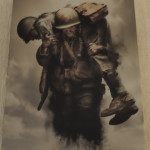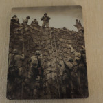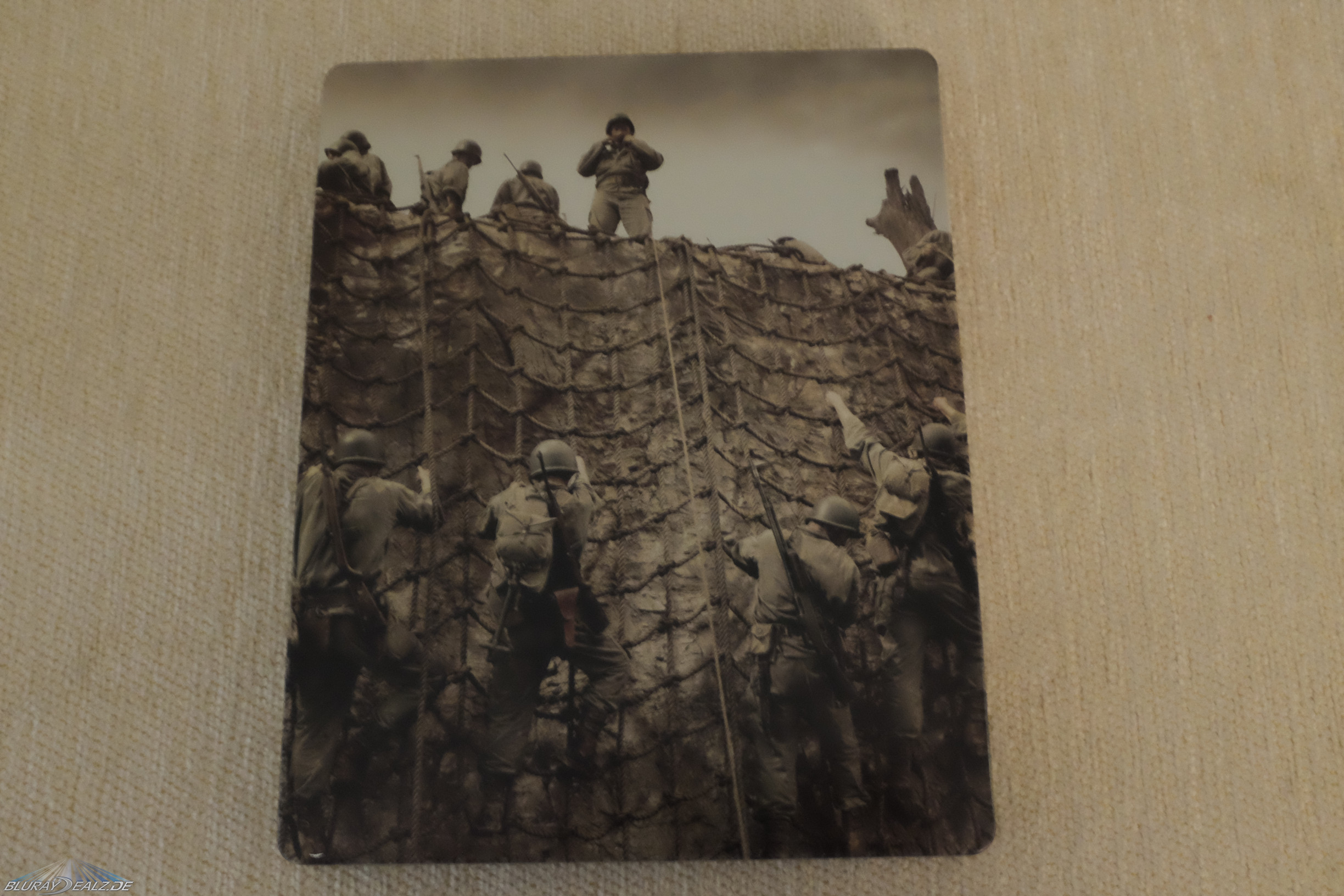 Auf der Rückseite sieht man die Felswand, die die Armee zunächst besteigen musste, bevor es direkt auf das Schlachtfeld ging. Außerdem ist es die Felswand, die Doss seine Kameraden runtergeseilt hat, damit unten die anderen die Verletzen aufnehmen können. Auch hier keine Prägung, kein Schriftzug, einfach nur ein Bild, wo einige die Seilen hochklettern und andere bereits oben angekommen sind. Es ist ein anderes Motiv auf der Rückseite, ist also im geöffneten Zustand von außen keine durchgehende Abbildung.