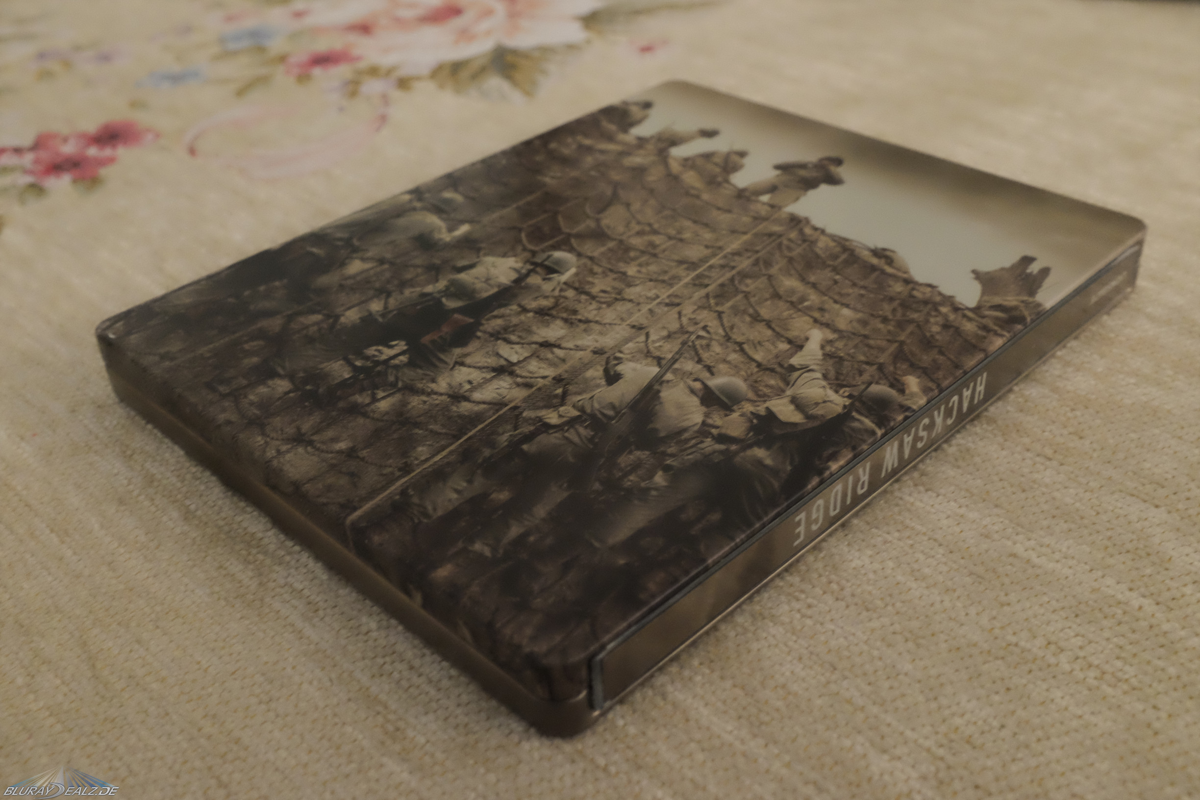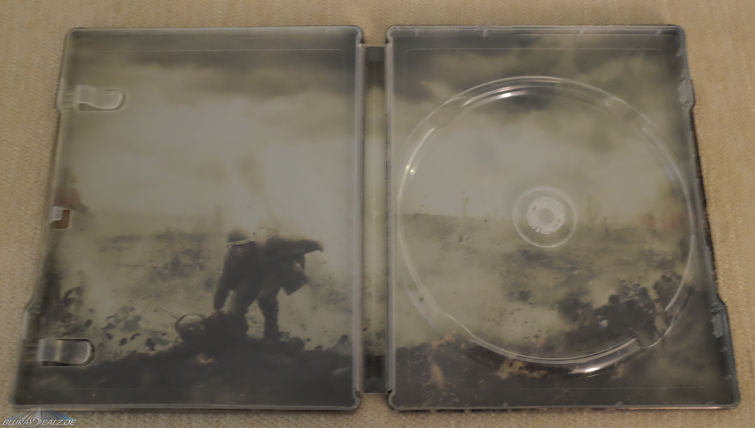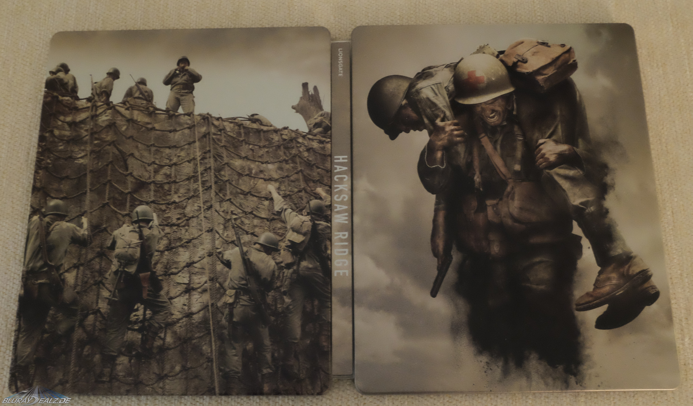 Wenn man das Steelbook öffnet, sieht man den Innendruck, der aus einem zusammenhängen Abbildung besteht. Es zeigt das Schlachtfeld und den Kampf zwischen den US-Amerikanern und den Japanern, während man Doss links sieht, wie er einen Kollegen wegzuschaffen versucht. Man sieht ebenfalls sehr viel Rauch, der durch verschiedene Explosionen aus dem Boden steigt. Der Innendruck ist deutlich erkennbar und in Farbe, aber trotzdem erscheint es relativ gräulich, was aber zu der Kriegsstimmung passt.