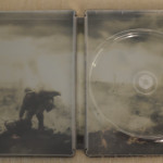 Das Steelbook selbst ist matt und bloß metallisch glänzend, also kein (spot)gloss. Der Front als auch die Rückseite sind vollständig ohne Schrift wie Titel, Schauspieler oder Credits. Fingerabdrücke sieht man durch die matte Oberfläche nicht. Eine Prägung ist zudem auch nicht vorhanden, man legt das Augenmerk somit komplett auf das Cover. Ob ein Steelbook einen Titel auf der Front haben sollte oder nicht finde ich immer stark coverabhängig und in dem hier vorliegenden Fall finde ich es so in Ordnung, da das Zusammenspiel aus Titel und Cover in diesem Fall hier nicht gepasst hätte.