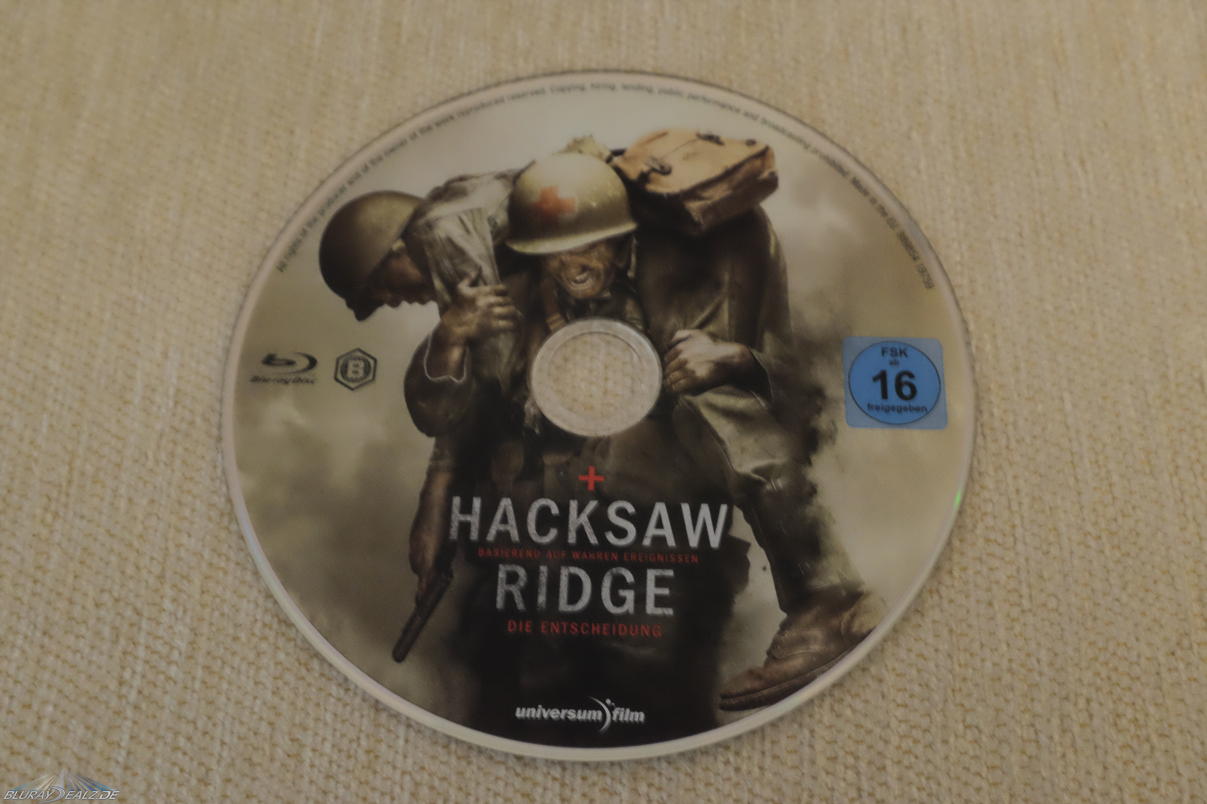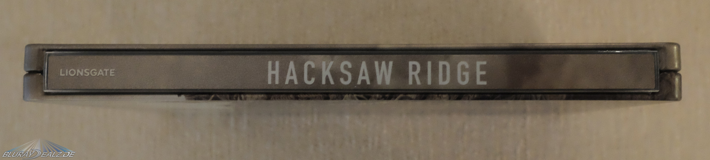 Auf dem Spine sieht man ganz oben den Schriftzug von Lionsgate und dem Titel des Films, Hacksaw Ridge, mittig ausgerichtet. Kein Blu-ray-Schriftzug, keine Prägung und die Farbe des Spines ist im gleichen Grundton wie der Front und die Rückseite.