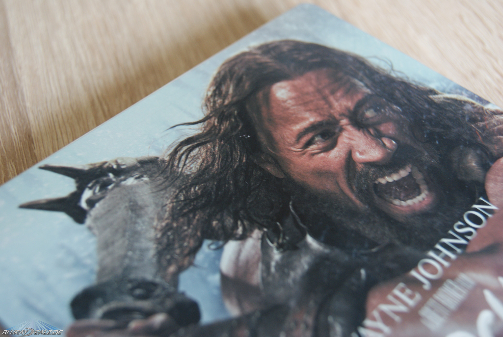 Die Frontseite ist meiner Meinung nach der größte Blickfang des Steelbooks. Der im obigen Bereich des Steels sichtbare Hintergund ist ebenso wie die Schriftzüge (die nicht sonderlich stören, da recht wenig) matt. Das über das ganze Steelbook dargestellte Feuermotiv und das Bild von Hercules alias Dwayne Johnson selbst sind jedoch glossy und glänzen was das Zeug hält. Der Titelschriftzug ist nach innen geprägt und weist einen wunderschönen Kontrast auf (aufgrund Prägung und Unterschied glossy-matt). Wirklich sehr gelungen.