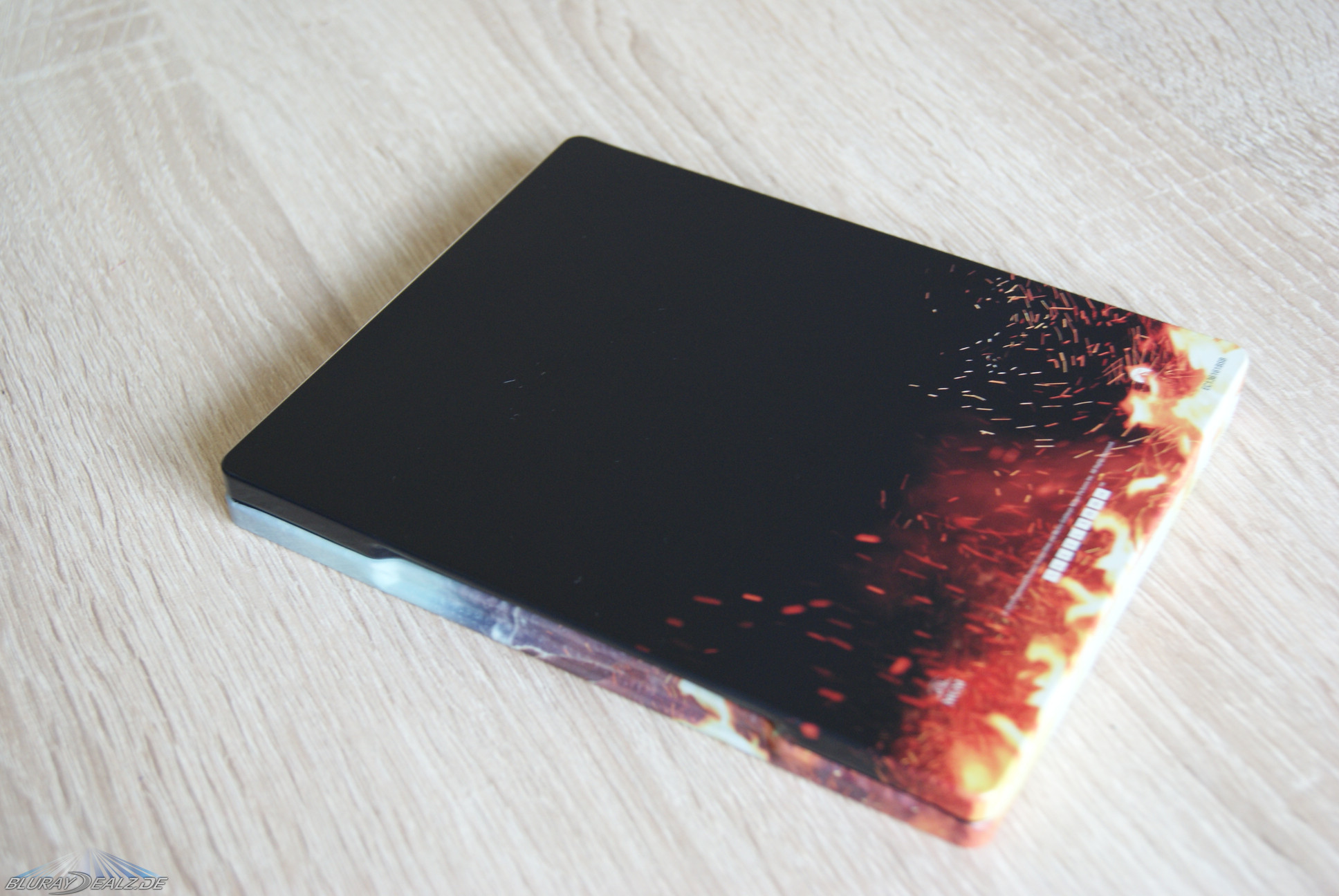 Der Titeldruck auf dem Spine verläuft von oben nach unten. Der Spine selbst ist schwarz und setzt das Feuermotiv auf Front- und Rückseite fort. Sehr schön, das macht immer einen guten Eindruck. Schön auch, das dieses Motiv auch auf der Verschlussseite ist. Das Steelbook ist also komplett von dieser Feuerwand eingeschlossen. Das wurde mal prima umgesetzt, ein großes Lob dafür.