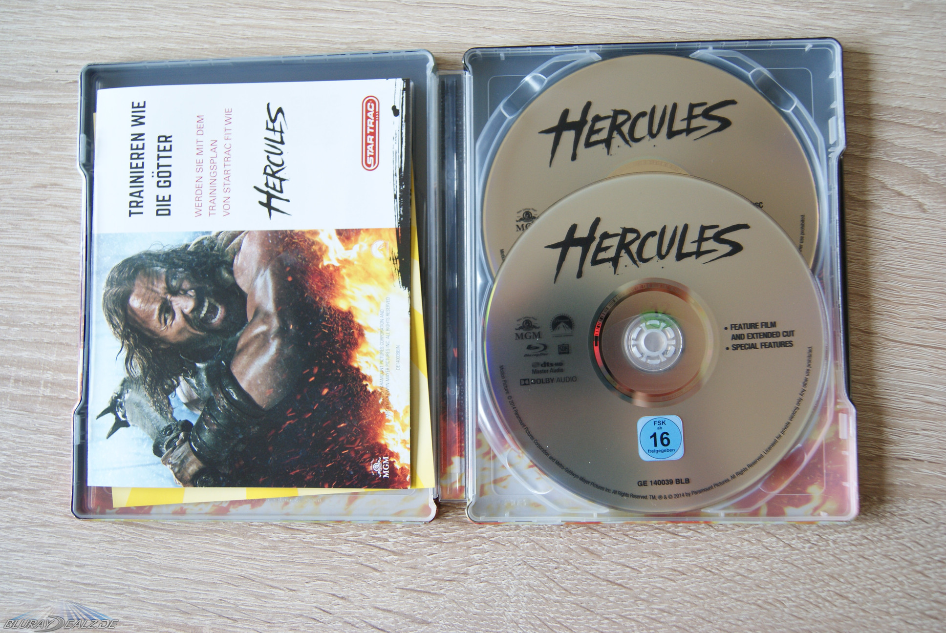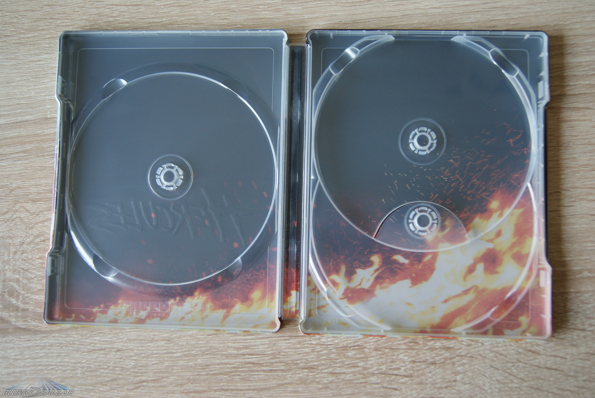 Im Inneren befindet sich neben den Discs (3D-Blu-ray mittig auf der linken Seite, 2D- und Bonus-Blu-ray vertikal versetzt auf der rechten Seite) noch zwei Werbeflyer (Einmal der erwähnte 5€-Pizza.de-Gutschein und zum zweiten einer von StarTrac, die mit dem Trainingsplan von Hercules aufwarten, welcher sich mittels QR-Code aus dem Netz runterladen lässt. Also erst Pizza und dann Training!). Paramount-typisch handelt es sich bei den Discs um reine Silberlinge ohne jedweden farbigen Druck – das lernen die nie. Das Innenmotiv zeigt das auf den Steelbook schon benutzte Motiv der von rechts nach links abfallenden Feuerwand. Dies sieht auch hier ganz nett aus, aber ansonsten herrscht nur Schwärze. Schade.