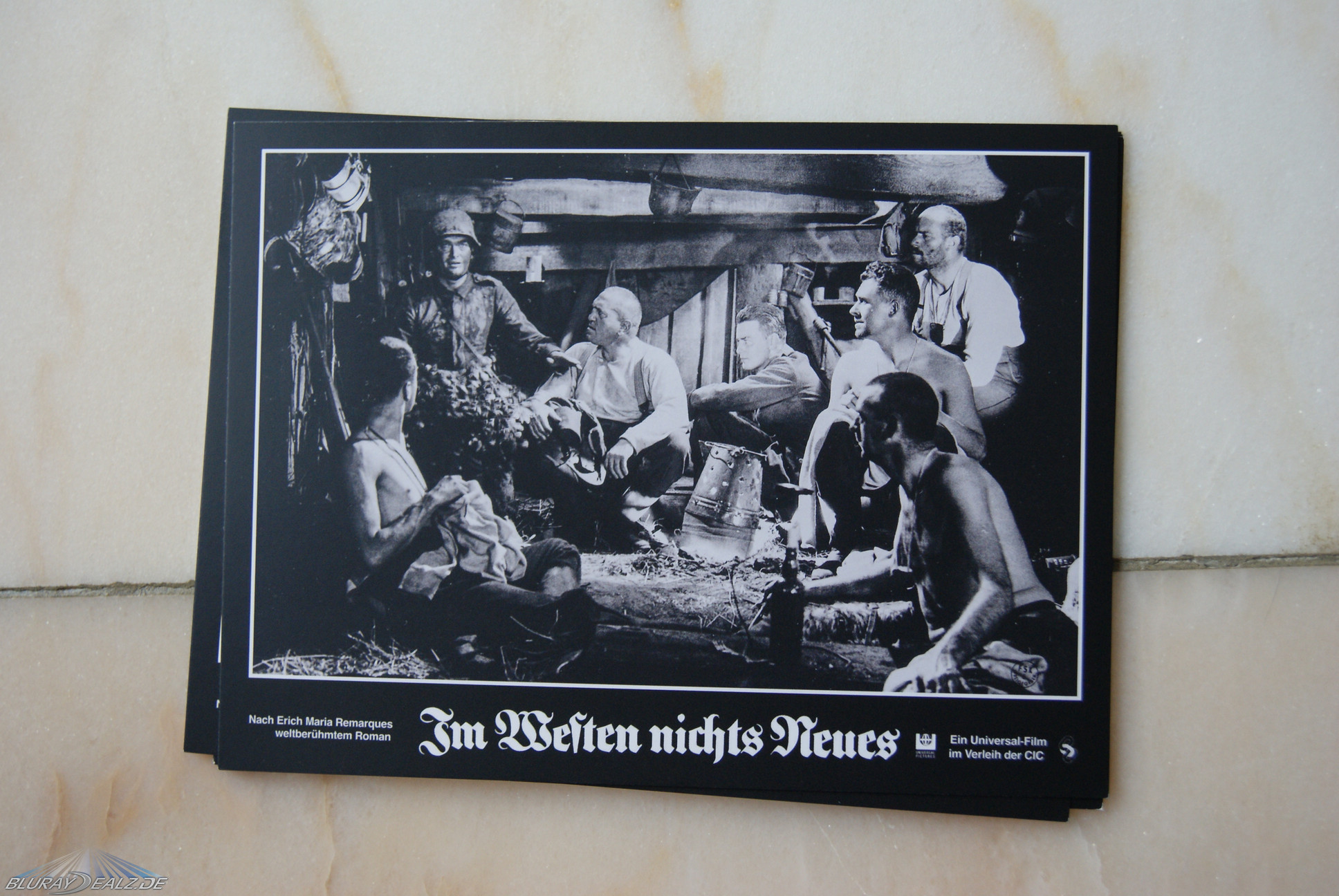 Die acht Repliken der originalen Aushangfotos haben eine schöne grüße und annehmbare Dicke der Pappe – das geht durchaus besser, ist aber in Ordnung. Der Verzicht auf Hochglanz ist ob des zugrundeliegenden Films ebenfalls als positiv zu werten. Die Rückseiten sind unbedruckt.