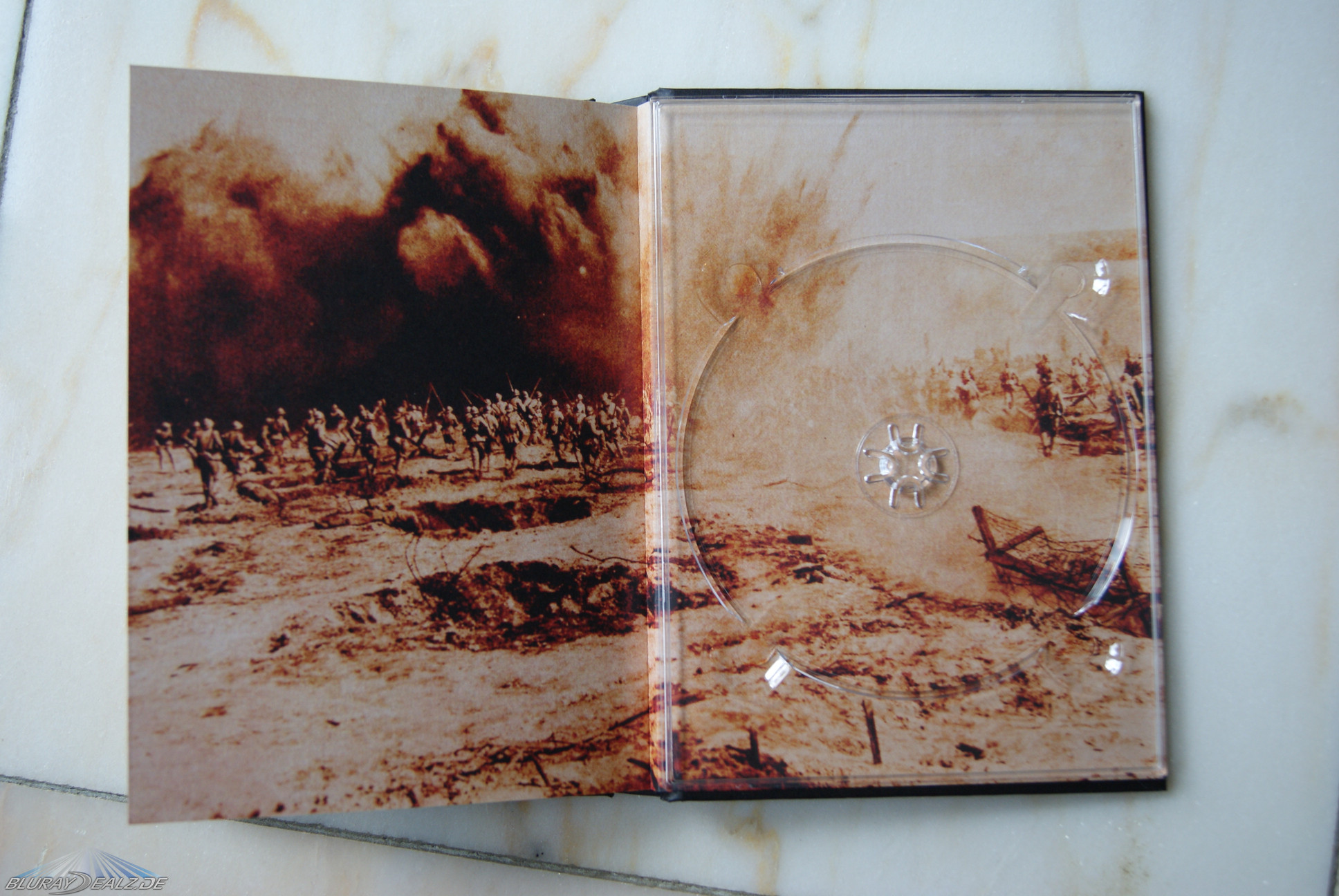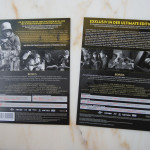 Ich fange ja ungern direkt mit dem größten Kritikpunkt an, aber meine Detailbeschreibungen gehen nun mal von „außen nach innen“. Deswegen versuche ich trotzdem mal das Positive. Der Flatschen ist auf der Einschweißfolie und verschwindet nach dem Auspacken. Die Infokarte auf der Rückseite ist wie bei Capelight gewohnt nicht befestigt und hält den Karton textfrei (die Infokarte zeigt auf der einen Seite alle Info zum Film, zur Edition und die Specs und hat auf der anderen Seite noch ein schönes Motiv). Hier der erste kleine Mangel: Leider ist die Karte zu groß, als dass sie hinterher mit in die Edition gepackt werden kann – das macht Turbine beispielsweise besser. Das Design ist ebenfalls sehr schön, der deutsche Titel vorne mit einem gezeichneten Motiv und der Soldat auf der Rückseite mit dem englischen Titel sind gut gewählt. Ebenso positiv zu erwähnen ist der leichte Magnetverschluss der Box, der aber schon beim Kippen der Edition den Inhalt nicht halten kann.