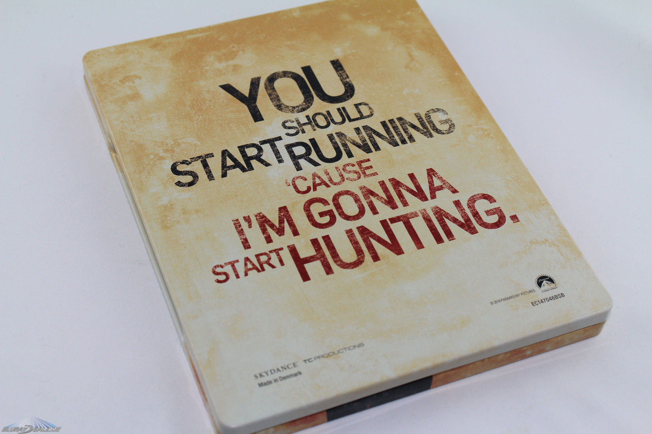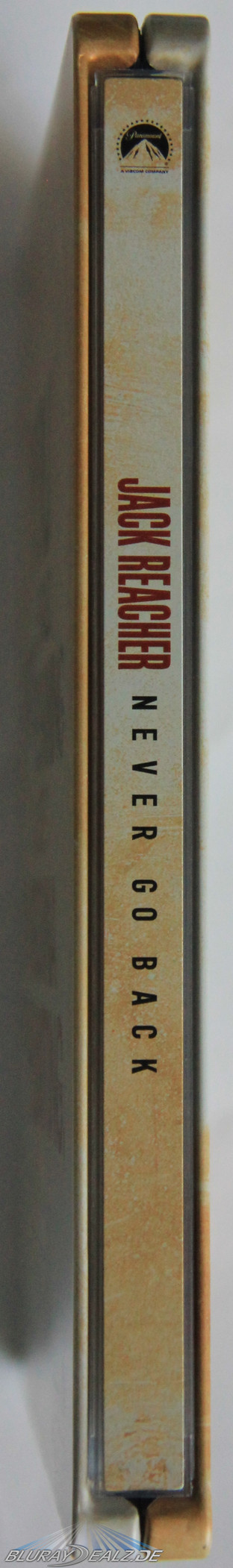 Alle Infos finden auf einer mit Klebepunkten angebrachten J-Card Platz. Das Steelbook selbst ist matt gehalten, was zu dem Artwork passt. Auf der Vorderseite ist der Titel „Jack Reacher – Never Go Back“ komplett gestanzt (debossed) sowie in Spot Gloss gehalten. Das sieht sehr edel aus und wird durch den Spot Gloss für Tom Cruises Namen noch ergänzt. Reacher/Cruise selbst ist wie der Rest der Vorderseite matt gehalten und setzt sich so vom Titel ab. Dabei hilft auch die überlegte Prägung, welche durch die Überschneidung mit Reacher einen gefühlten 3D-Effekt erzeugt. Eine gelungene Kombination! Zudem weist der fast sandig wirkende Hintergrund einen netten Schimmereffekt auf. Optisch ein Leckerbissen. Und dank der matten Optik auch kein Fingerabdruckmagnet wie das Steelbook des Vorgängers.