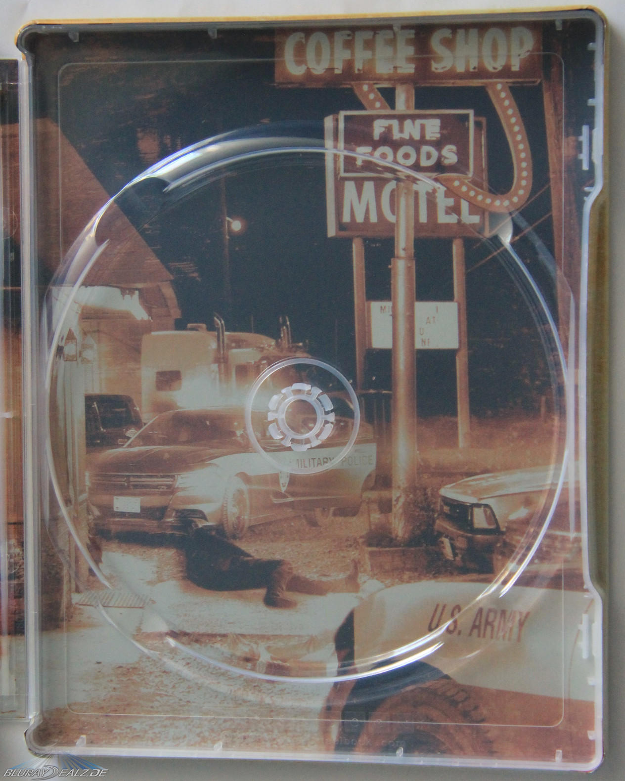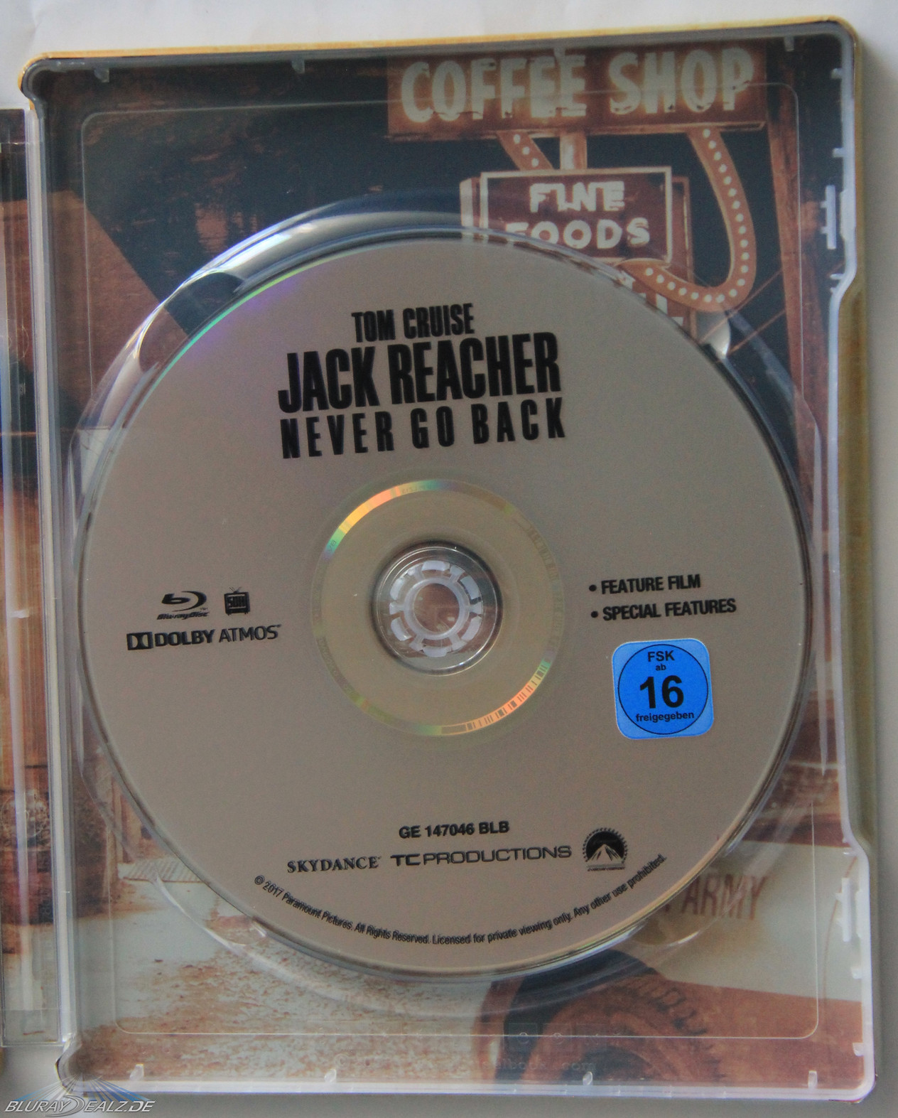 Das Innenartwork zeigt die Diner-Szene vom Anfang des Films und ist damit eine tolle Wahl. Die Farbgebung des Motivs gleicht sich zudem sehr gut an den Look des Steelbooks an. Auch der Druck ist sehr kräftig und scharf, womit es hier nichts zu bemängeln gibt. Allerdings ist das Disc-Design wie Paramount-üblich nicht vorhanden, was einmal mehr sehr schade ist.