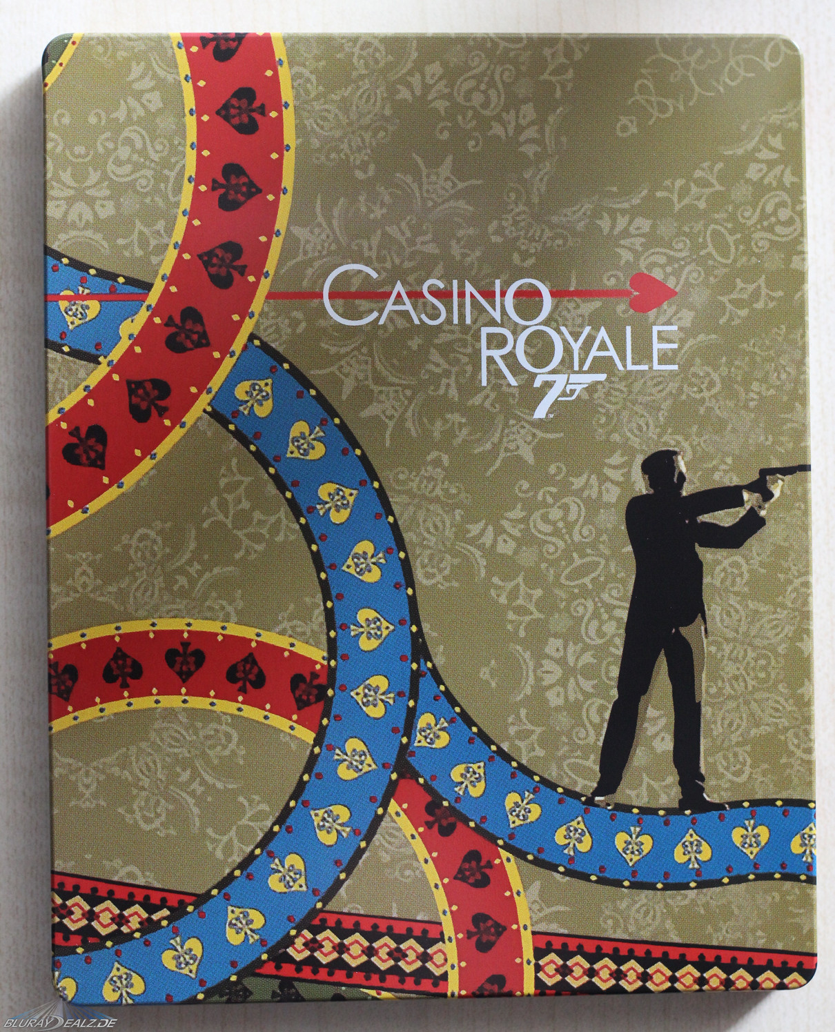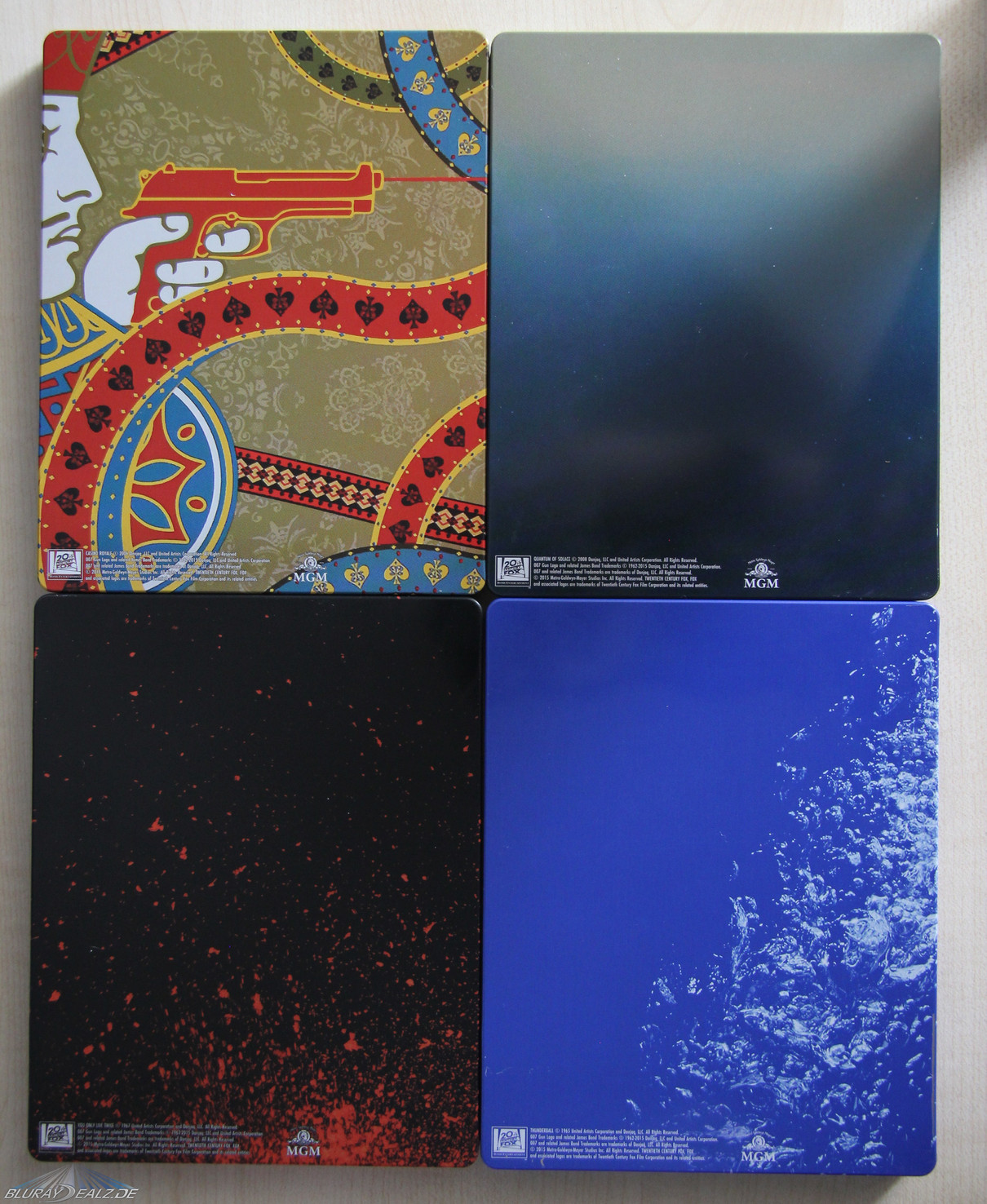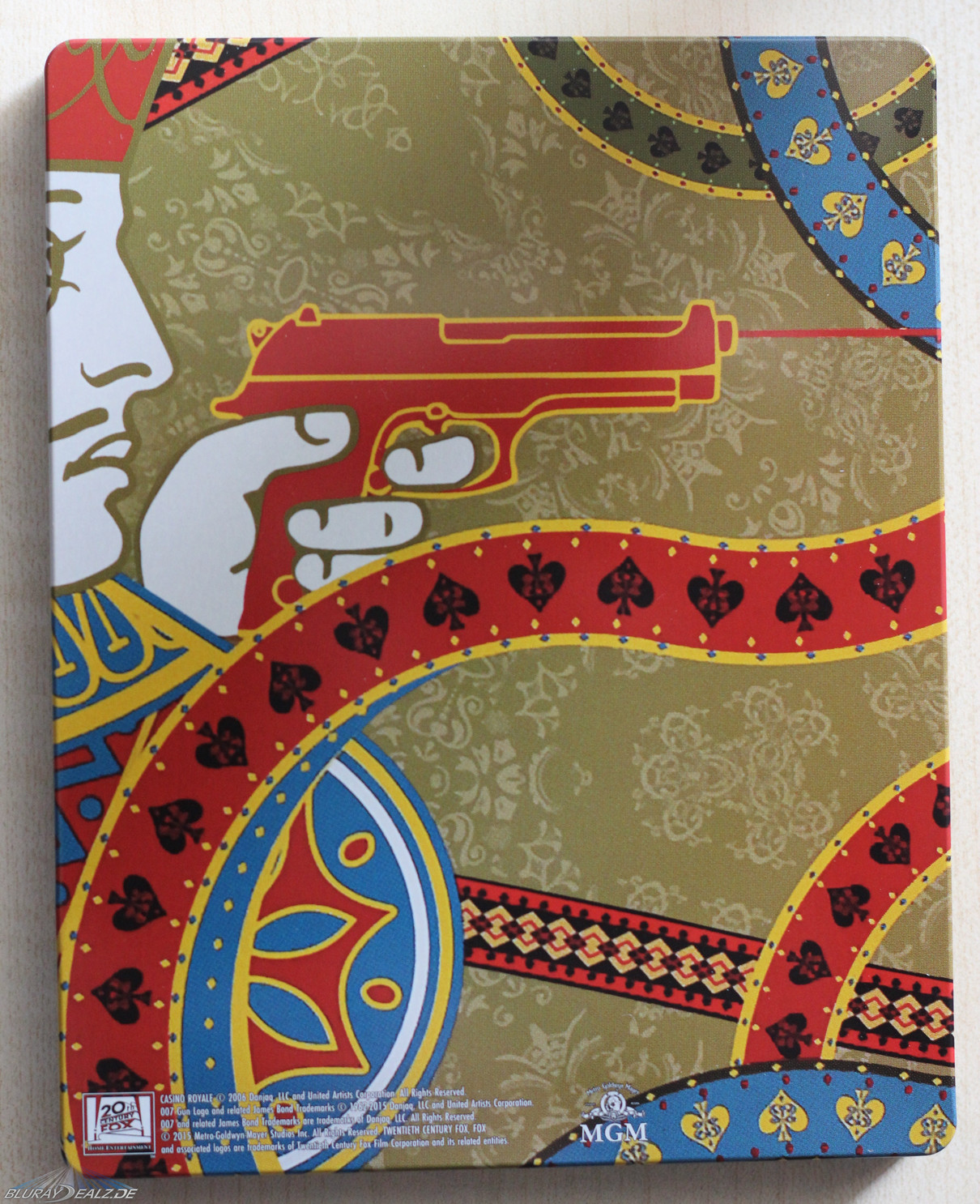 Bei CR sieht man demnach Bond, wie er durch das Kartenspielintro des Films läuft und mit seiner Waffe zielt. Extrem positiv ist neben der gelungenen Wahl bei diesem Steelbook die Ausführlichkeit des Artworks hervorzuheben, welche doch in starkem Kontrast zu den meisten verhältnismäßig simpler gestalteten Steelbooks der Reihe steht. Verwendet wurde zudem der Originaltitel auf den Steelbooks, was für mich ein klarer Pluspunkt ist (auch wenn das sicher Fans wie Kritiker hat).