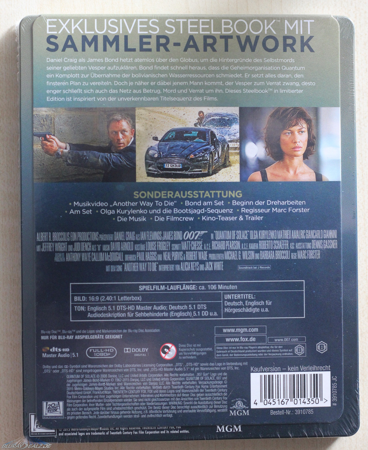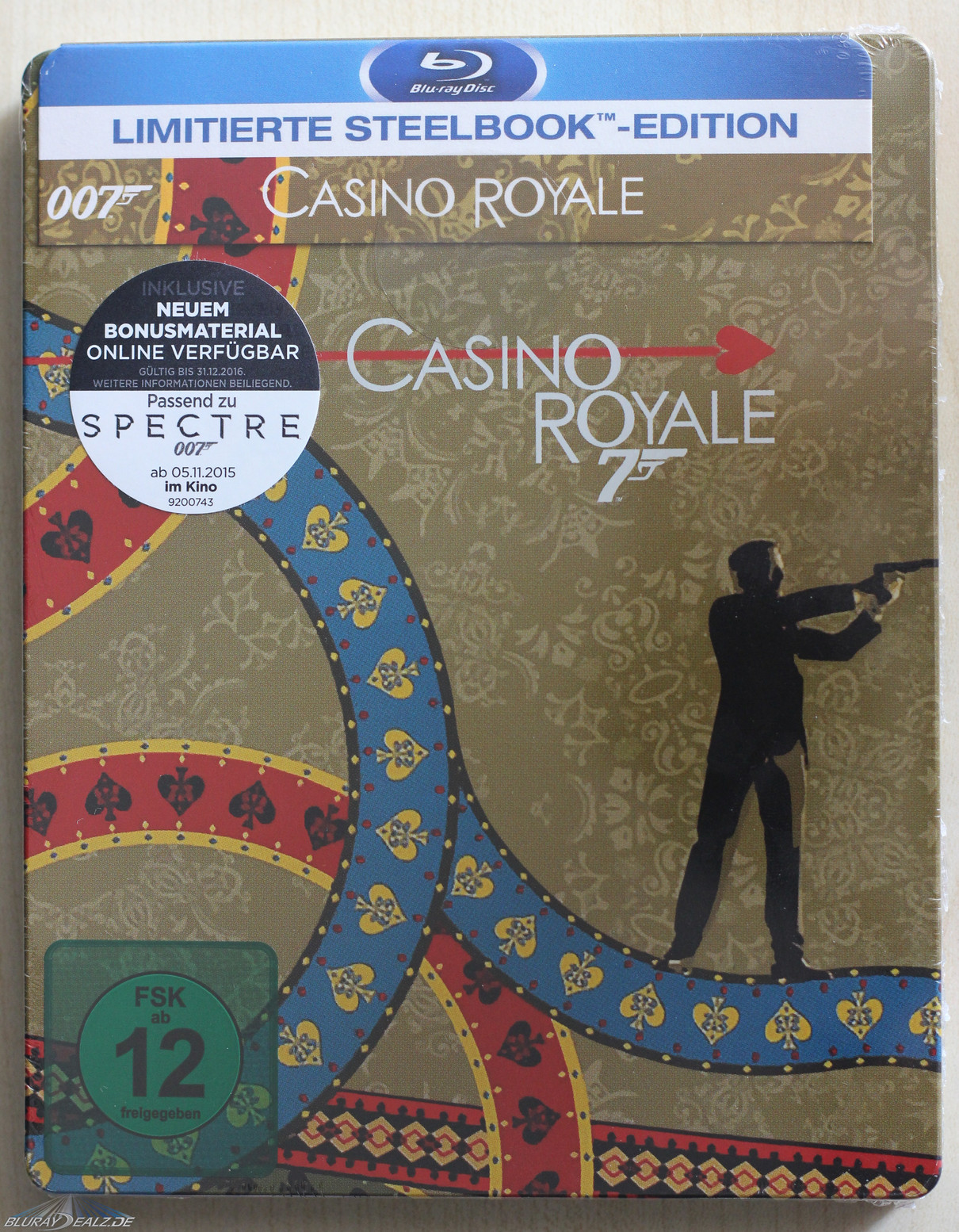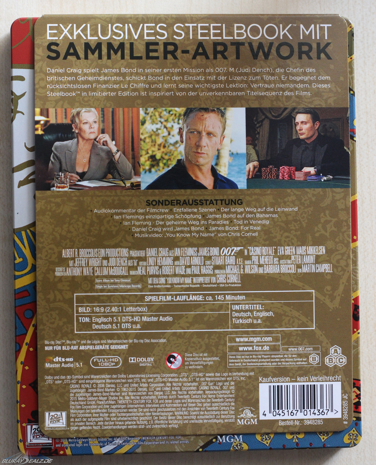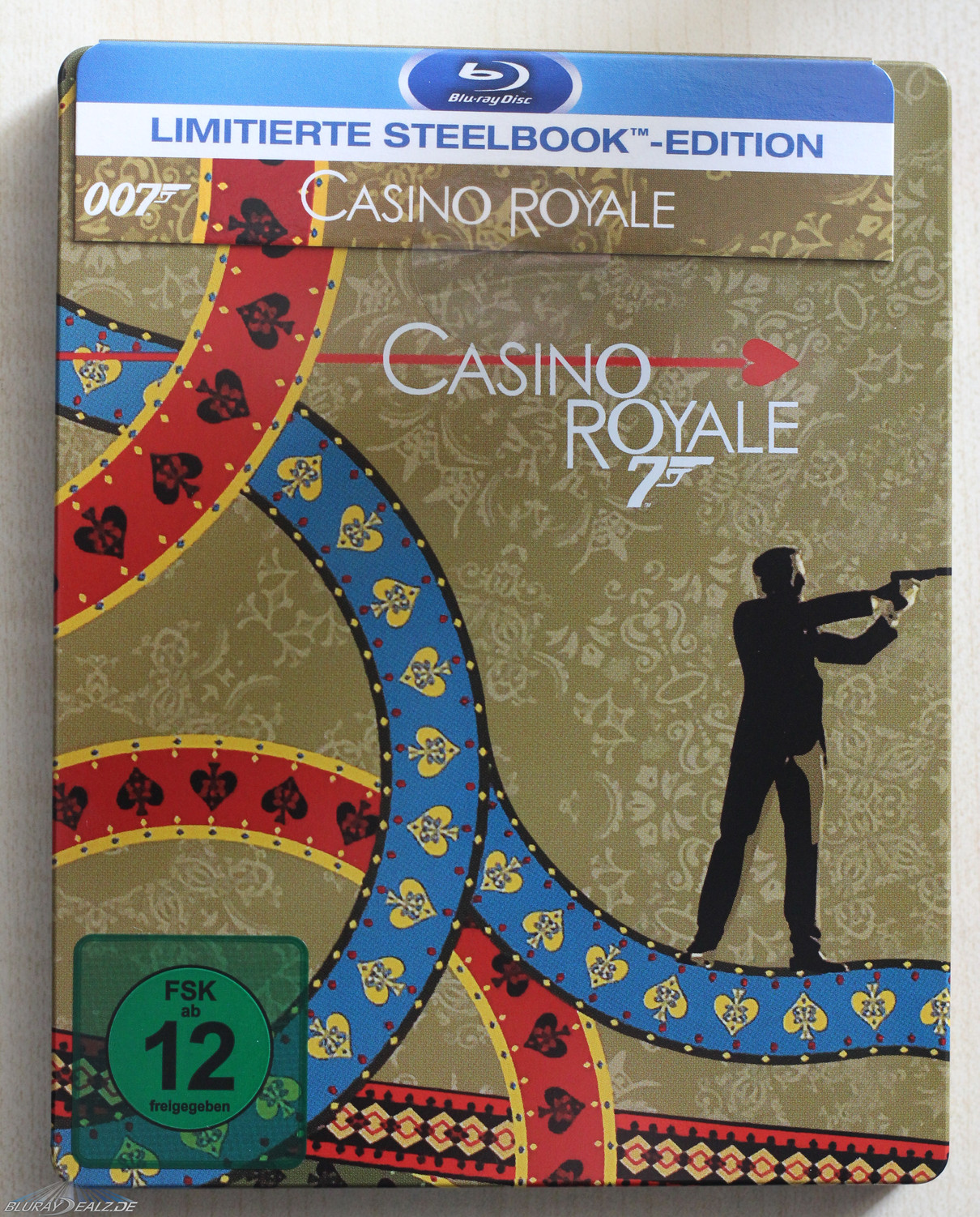 Bei CR sieht man demnach Bond, wie er durch das Kartenspielintro des Films läuft und mit seiner Waffe zielt. Extrem positiv ist neben der gelungenen Wahl bei diesem Steelbook die Ausführlichkeit des Artworks hervorzuheben, welche doch in starkem Kontrast zu den meisten verhältnismäßig simpler gestalteten Steelbooks der Reihe steht. Verwendet wurde zudem der Originaltitel auf den Steelbooks, was für mich ein klarer Pluspunkt ist (auch wenn das sicher Fans wie Kritiker hat).