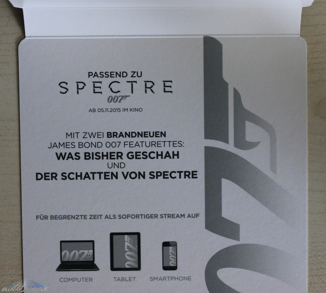 Die Steelbooks sind zudem von einer stabilen J-Card aus Kartonpapier ummantelt, die passend zum Artwork designed wurde und alle Infos aufweist. Auf der Innenseite der J-Card befindet sich jeweils ein Code, mit dem man Zugang zu den zwei neuen und exklusiven Bonus-Featurettes „Was bisher geschah“ und „Der Schatten von SPECTRE“ erhält, die auf den neuen Film einstimmen sollen. Diese sind online-exklusiv und können durch Eingabe des Codes auf PC, Tablet und Smartphone gestreamed werden. Der Online-Stream ist verfügbar bis zum 31.12.2016.