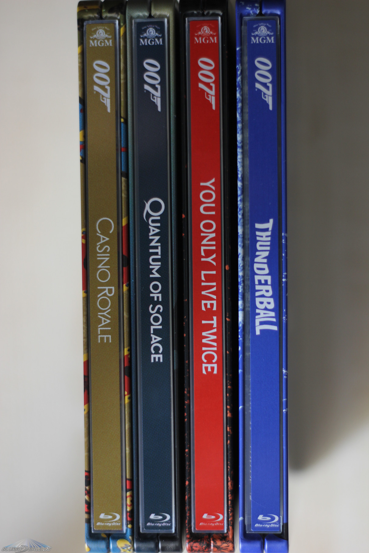 So sind die absoluten Highlights der Reihe neben dem auf der ganzen Linie überzeugenden CR-Steelbook die beiden Titel „Ein Quantum Trost“, welcher in der Hand wirklich extrem klasse wirkt (im Gegensatz zum oftmals kritisierten Film), und „Feuerball“, welches für mich das Highlight der gesamten Reihe ist. Das Steelbook wirkt besonders edel und hochwertig, was man allerdings erst wirklich genießen kann, wenn hier die Folie ab ist. Der das gesamte Steelbook einnehmende Schimmereffekt des blauen Hintergrundes ist extrem stark ausgeprägt und wirklich eine Augenweide. Auch „Man lebt nur zweimal“ sieht sehr schön aus und der Schimmereffekt des Rades wie der Feuerglut ist sehr schön anzusehen.
