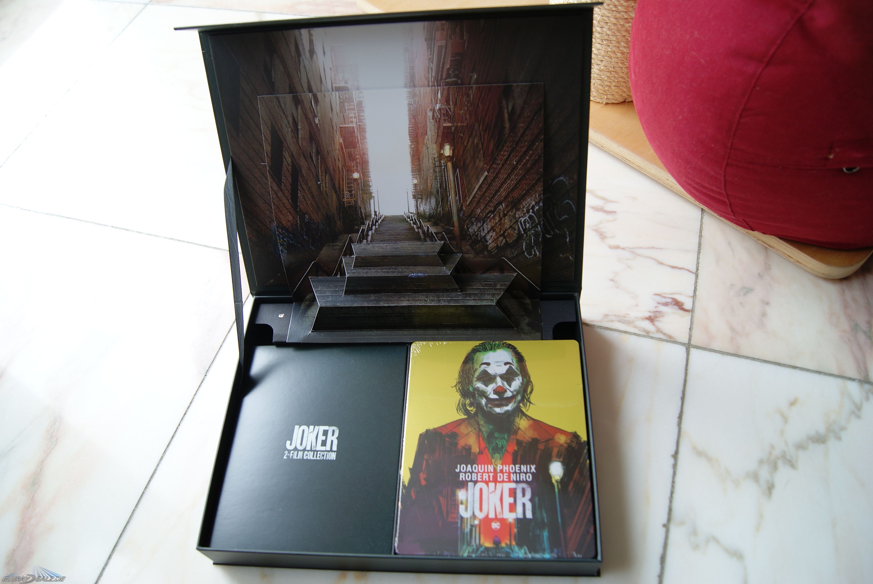 Im Innenren haben wir das bekannte Joker-Motiv aus Teil 1, mittelns eines Pop-Up-Effektes führt eine kleine Treppe zu ihm. Rechts sind die beiden noch eingeschweißten Steelbooks übereinander zu finden und auf der linken Seite der Umschlag mit den Extras. Ausziehbändchen gibt es nicht, dafür haben beide Fächer einen Eingriff zum Entnehmen des Inhaltes.