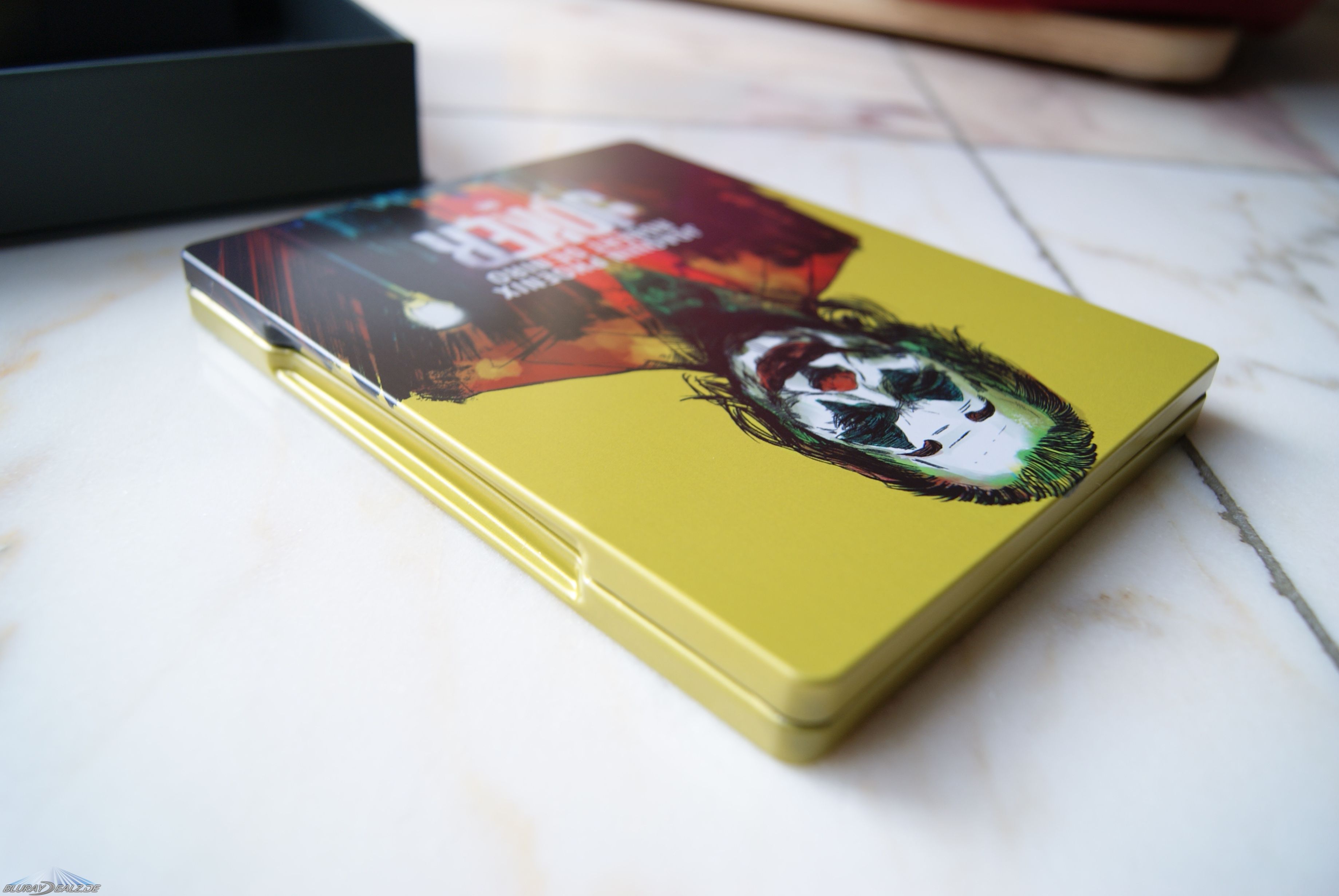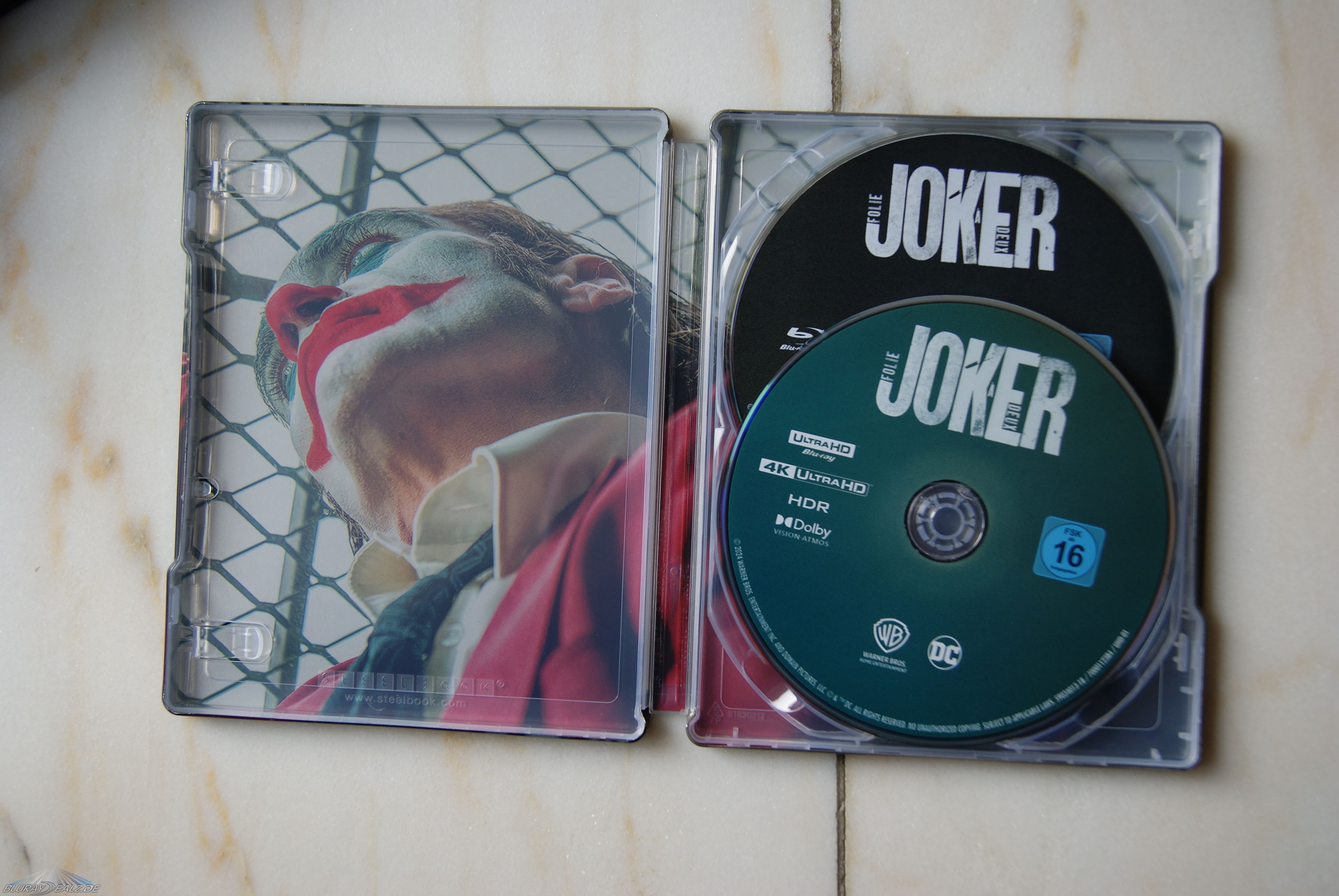 Das beiliegende Steelbook ist aus der Ultimate Collectors Edition und in dieser Editon noch einmal separat verschweißt. Der Hintergrund schimmert goldgelb, der Joker auf der Vorderseite ist ein beeindruckendes Motiv. Leider wird auf der Rückseite auf ein Motiv verzichtet. Im Inneren befinden sich beide Discs rechts – darunter gibt es ein farbiges Motiv als Innen-Artwork.