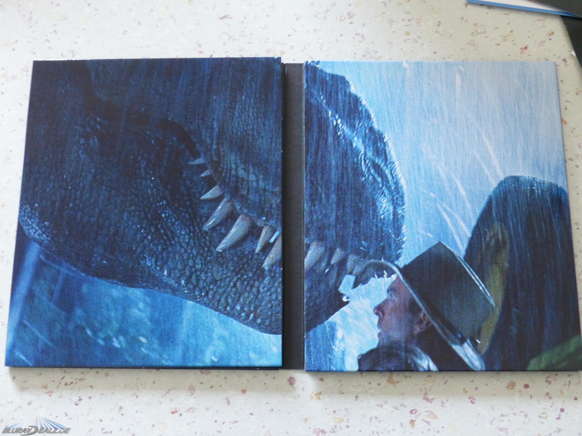 Der Schuber selber fühlt sich an wie dickes Fotopapier und ist somit anfällig für Fingerabdrücke. Die Discs lassen sich, entgegen meiner Befürchtung, leicht rausnehmen und reinschieben. Die Aufmachung gefällt mir sehr gut. Die Konzeptkarten zum neuen Jurassic World Teil sind ein super Gimmick und auch ein kleines Highlight, denn bisher sind diese auch nur in der UK Version vorhanden!