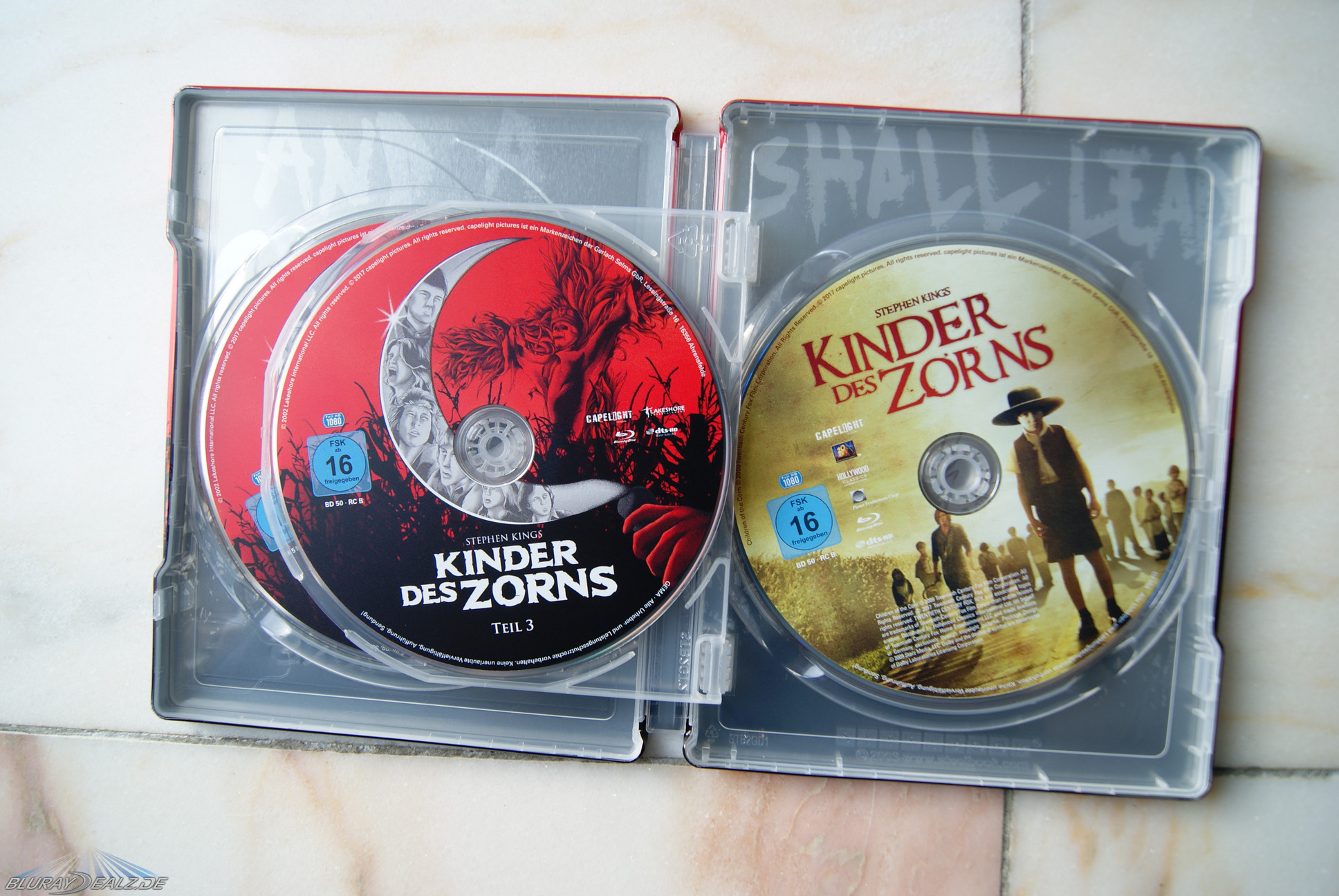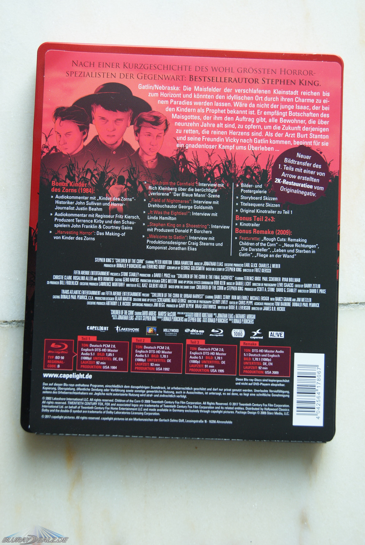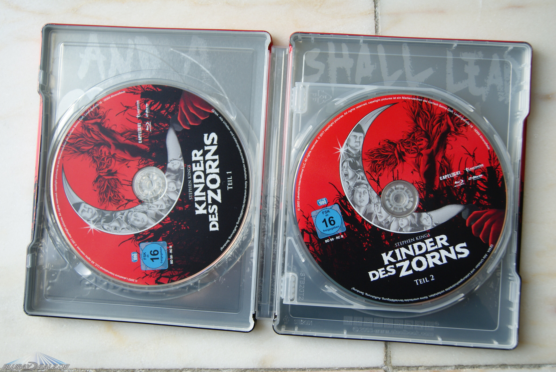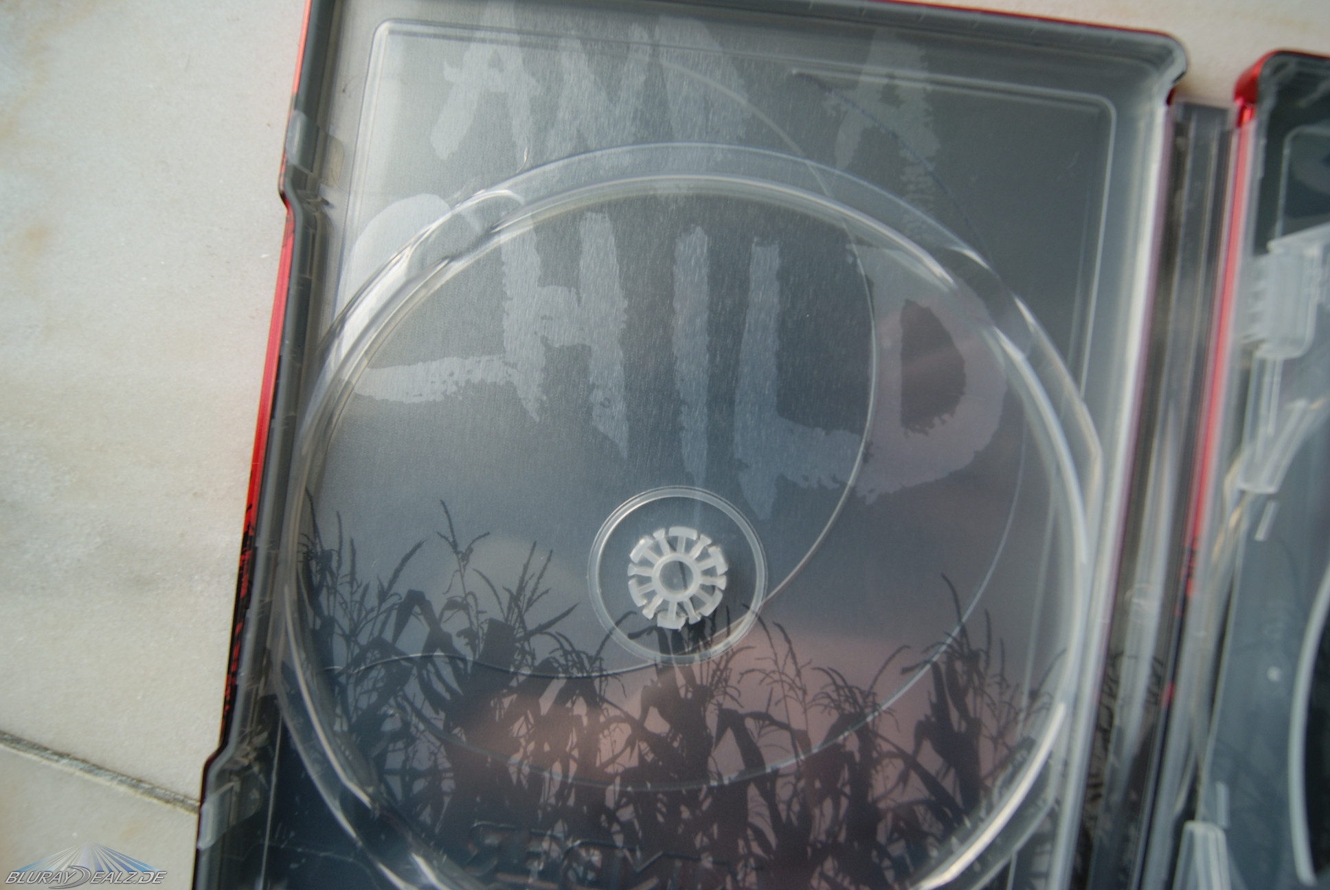 Der Innendruck ist für Capelight-Verhältnisse ordentlich. Wieder farblos, aber diesmal mit etwas mehr Schärfe. Unten ein Kornfeld und oben der Spruch „And Child Shall Lead Them“ – natürlich beides sehr passend. Teil 1 ist links untergebracht, Teil 2 und 3 auf einem Tray in der Mitte und das Remake (als einzige Disc mit separatem Cover) rechts.