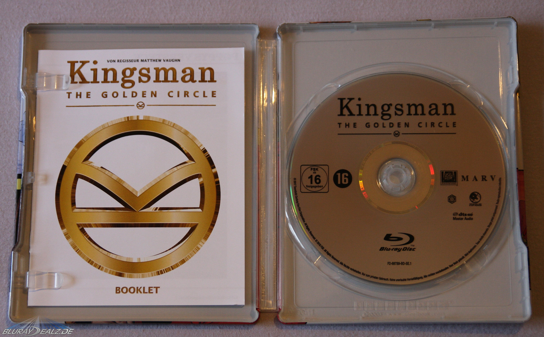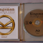 Öffnet man das Steelbook begegnen einem auf der linken Seite ein zwölfseitiges Booklet und auf der rechten Seite die Blu-ray Disk. Nimmt man beides heraus sieht man auf der linken Seite das Kingsman-Logo und auf der rechten Seite das Logo des Golden Circles als Innendruck – beide jeweils auf cremeweißen Hintergrund. Die Motivwahl hier ist im Gegensatz zur Außenseite allerdings sehr unspektakulär. Ein Highlight wäre es gewesen, wenn auch im Inneren Zeichnungen im Stil des Covers warten würden. Hier ist die Enttäuschung leider groß. Die Enttäuschung wächst noch weiter, wenn man die Disk betrachtet: Diese ist leider nur mit dem Titel und den üblichen Logos bedruckt und ansonsten halt CD-silbern. Die Innenseite ist also wirklich ein Dämpfer!