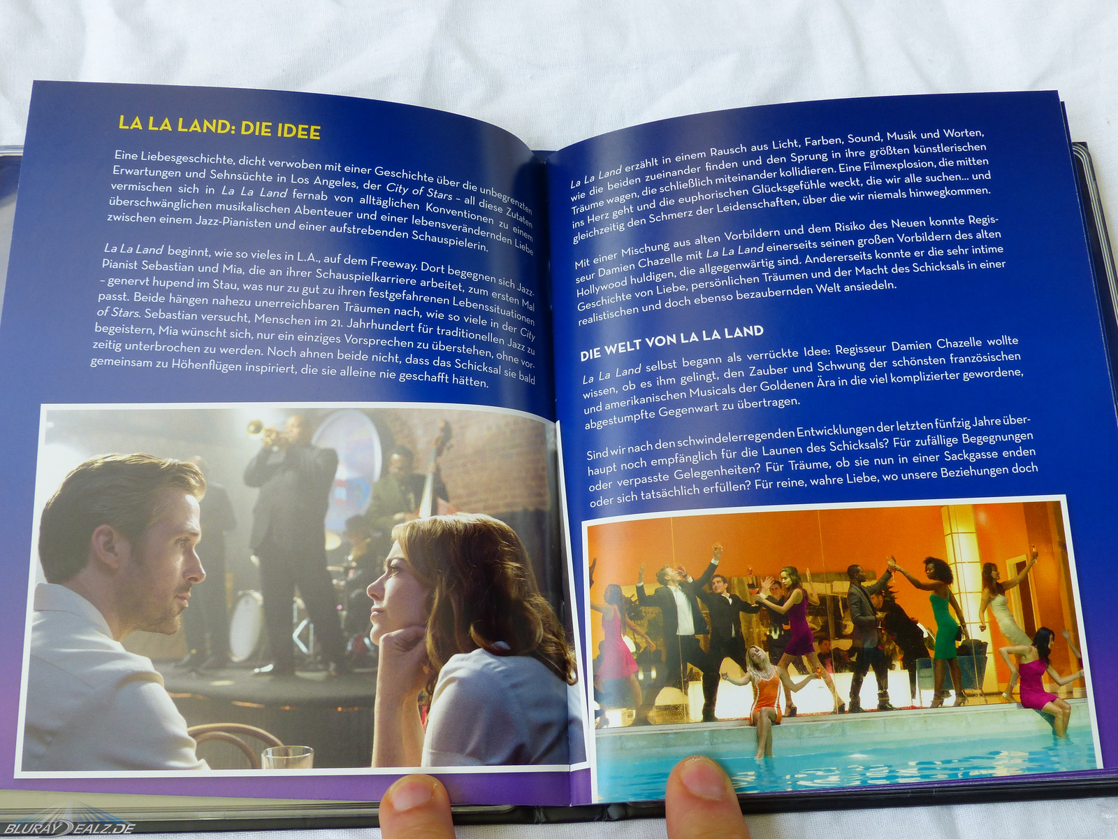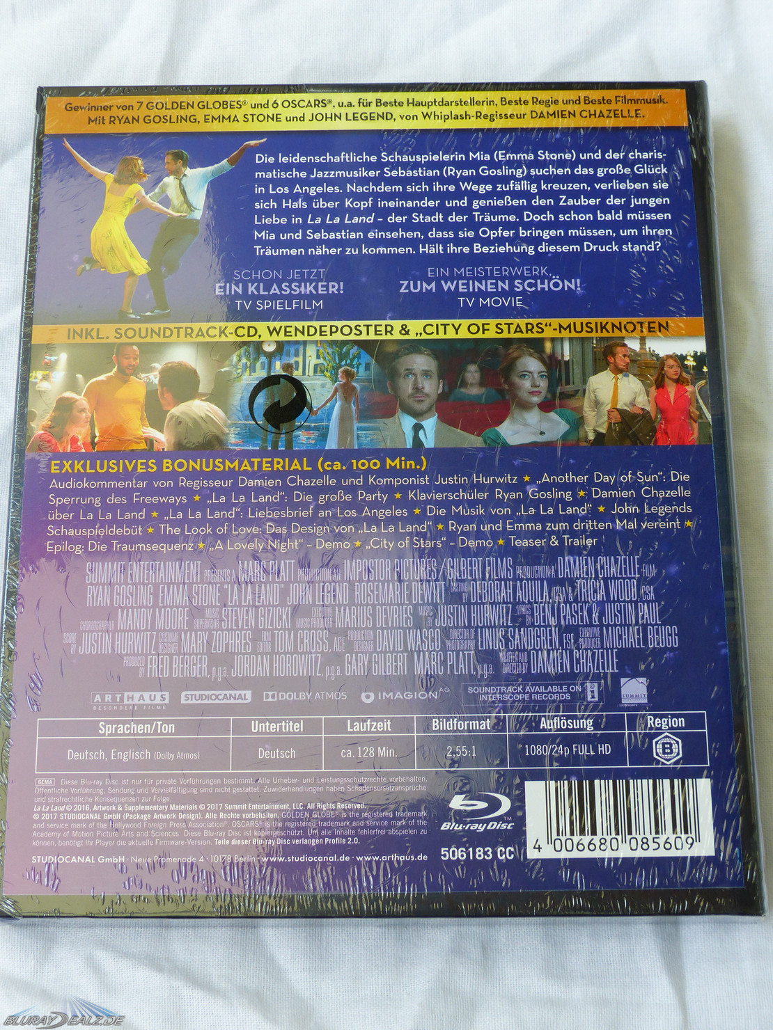 An Extras wurde sowohl auf der Disc, als auch im Mediabook nicht gegeizt. Gleich zwei Poster mit unterschiedlichen Motiven auf beiden seiten wurden angefertigt, davon eines mit den Klaviernoten für „City of Stars“. Aber jetzt kommt der Hammer: Legt man den Soundtrack in den CD Player ein, erscheinen 15 Titel. Es wurde der KOMPLETTE ORIGINAL SOUNDTRACK beigelegt!!!! Von anderen Veröffentlichungen mit Soundtracks weiß man, dass das nur Auszüge sind, hier nicht!!!!!