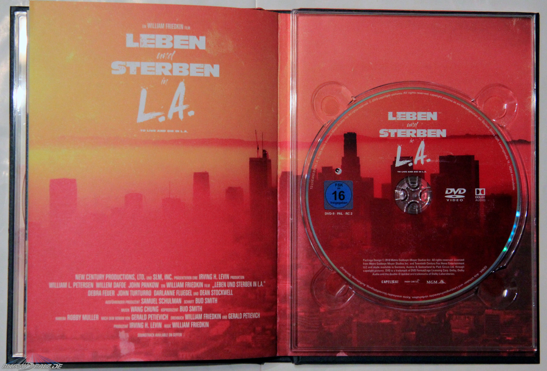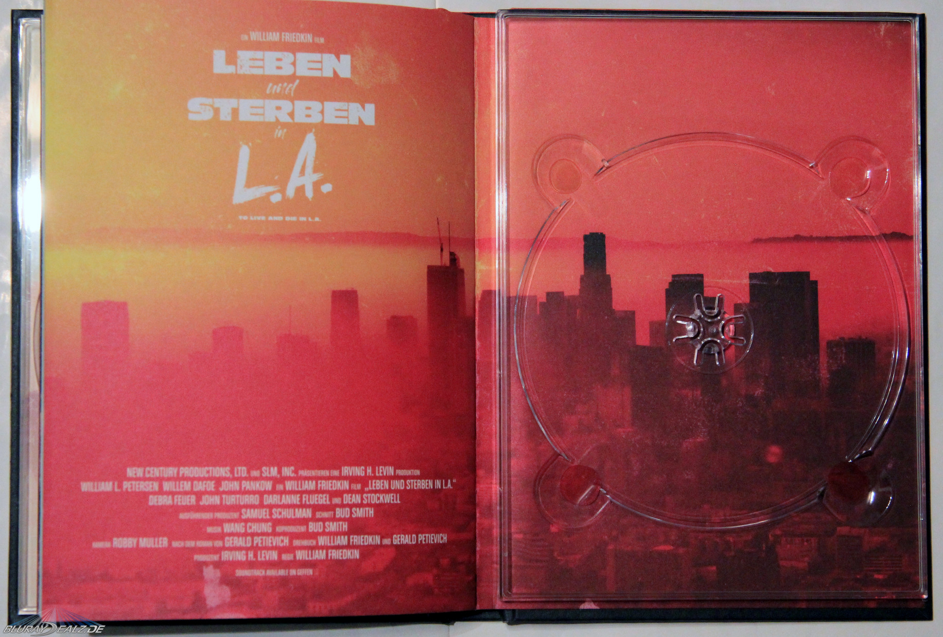 Das Frontmotiv zeigt dabei das bekannte Plakatmotiv, welches sich nahtlos über Spine und Rückseite erstreckt und LA im Hintergrund etabliert. Der Druck ist scharf und die Farbintensität ebenfalls gelungen. Das ganze Motiv ist in einem Vintage-Look gehalten und passend dazu ist das Mediabook einmal mehr auf edlem Tintoretto-Papier gedruckt. Das wirkt nicht nur stimmig, sondern sieht und fühlt sich klasse an.