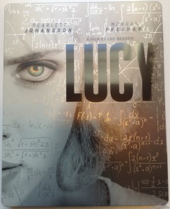 Das Frontcover wie auch das Backcover zeigen je eine Hälfte von Lucys Gesicht und die bereits erwähnten mathematischen Formeln. Im Gesamtbild des Außencovers ergibt sich somit ein durchgehendes und einheitliches Bild. Die Front ist zusätzlich mit den Namen der Hauptdarsteller wie auch Luc Besson betitelt. Der Titelgebende Schriftzug „Lucy“ ist in großen, schwarzen Buchstaben darstellt, wobei das „Y“ am „auflösen“ ist, was eventuell eine Anlehnung an die Wandlung der Hauptfigur darstellt.