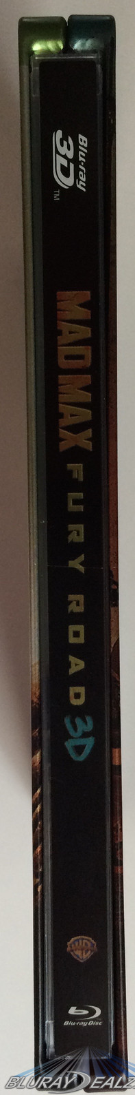 Das Backcover ist überfrachtet mit Text. Das Backcover zeigt erneut den Protagonisten „Max“ in einer für ihn im Film typischen Pose. Unten auf dem Backcover sind Studioinformationen aufgedruckt. Das Spine („Buchrücken“) trägt erneut den Aufdruck „Mad Max: Fury Road 3D“ sowie das 3D Blu-ray Logo. Das Ganze ist auf einen schwarzen Hintergrund gedruckt.