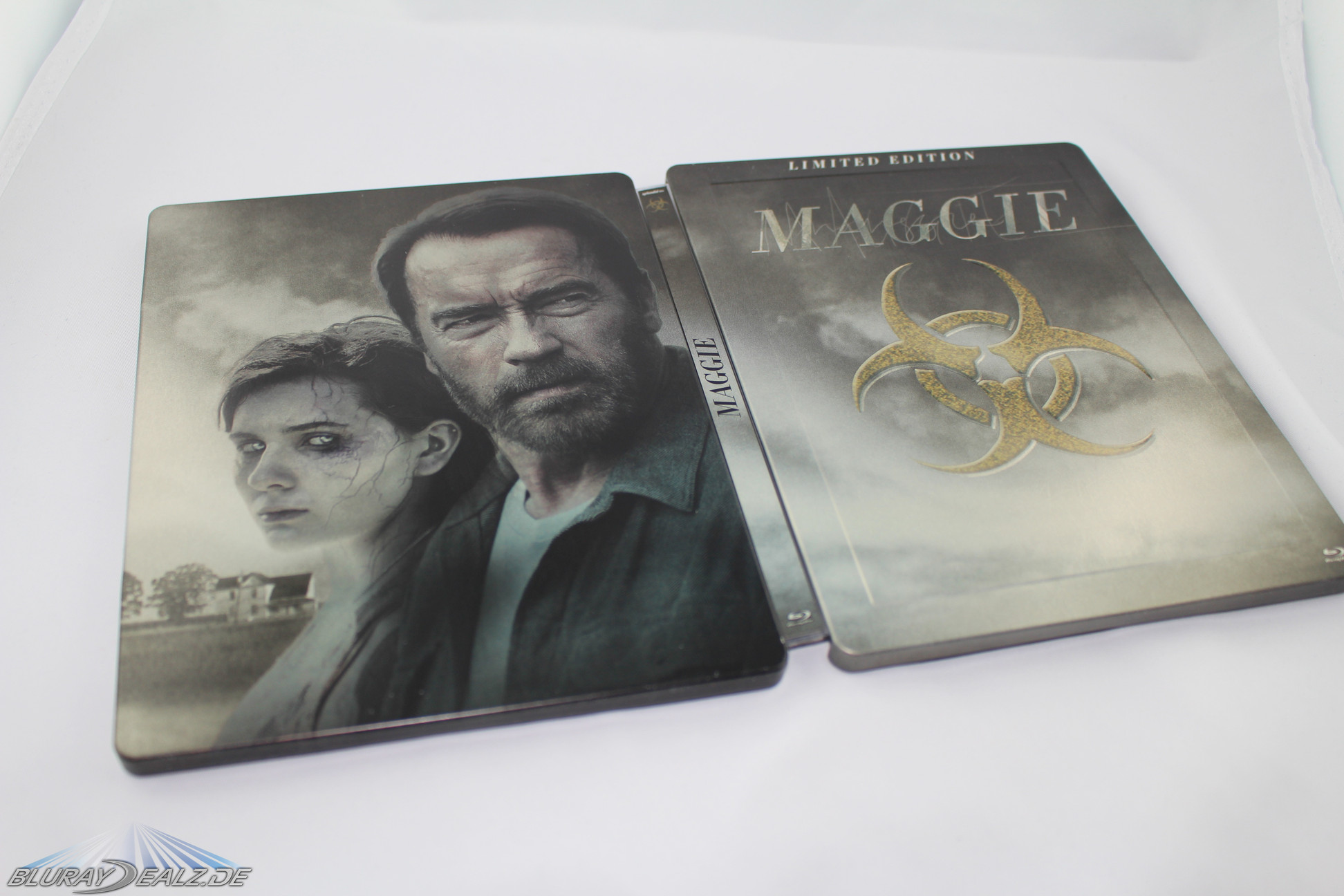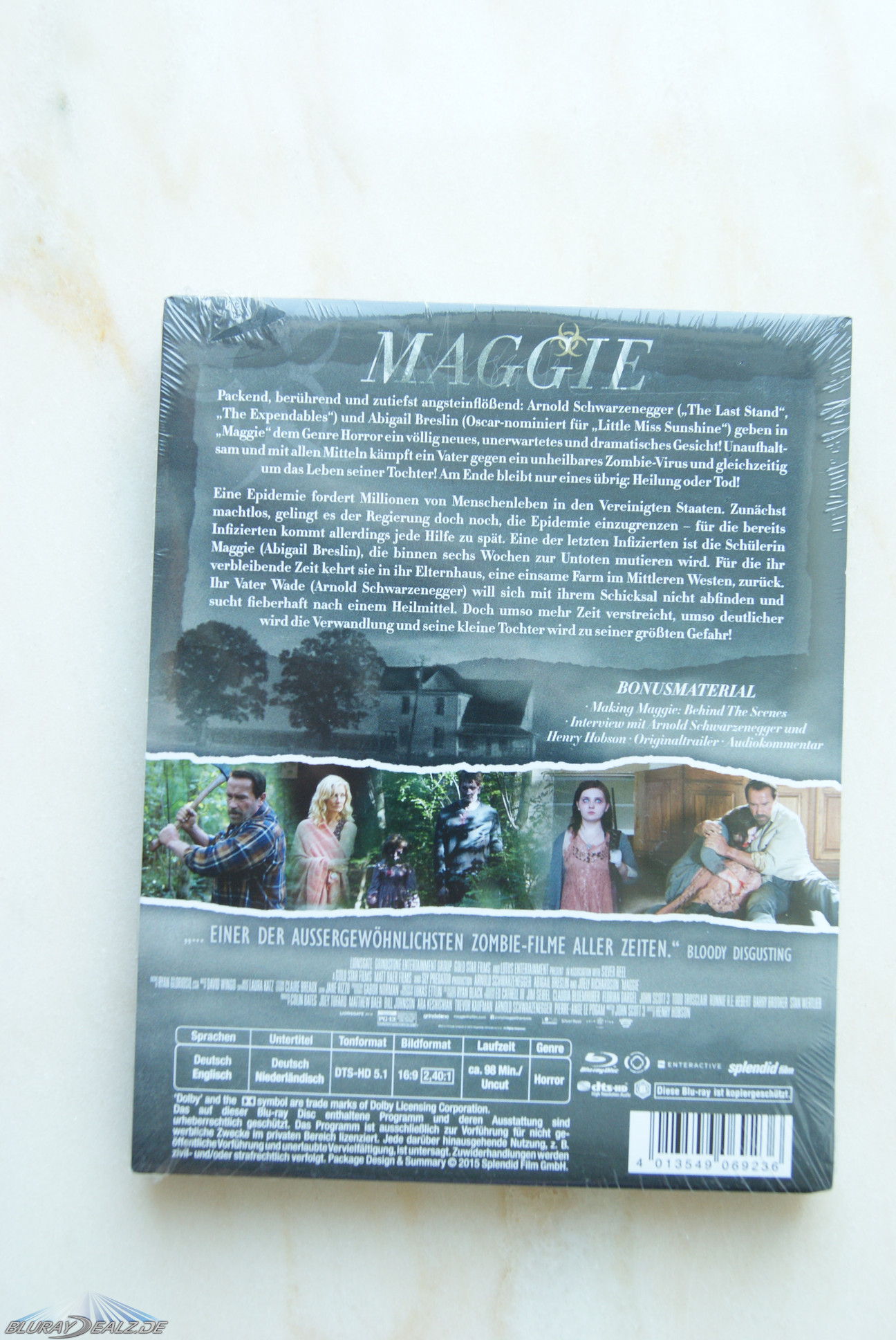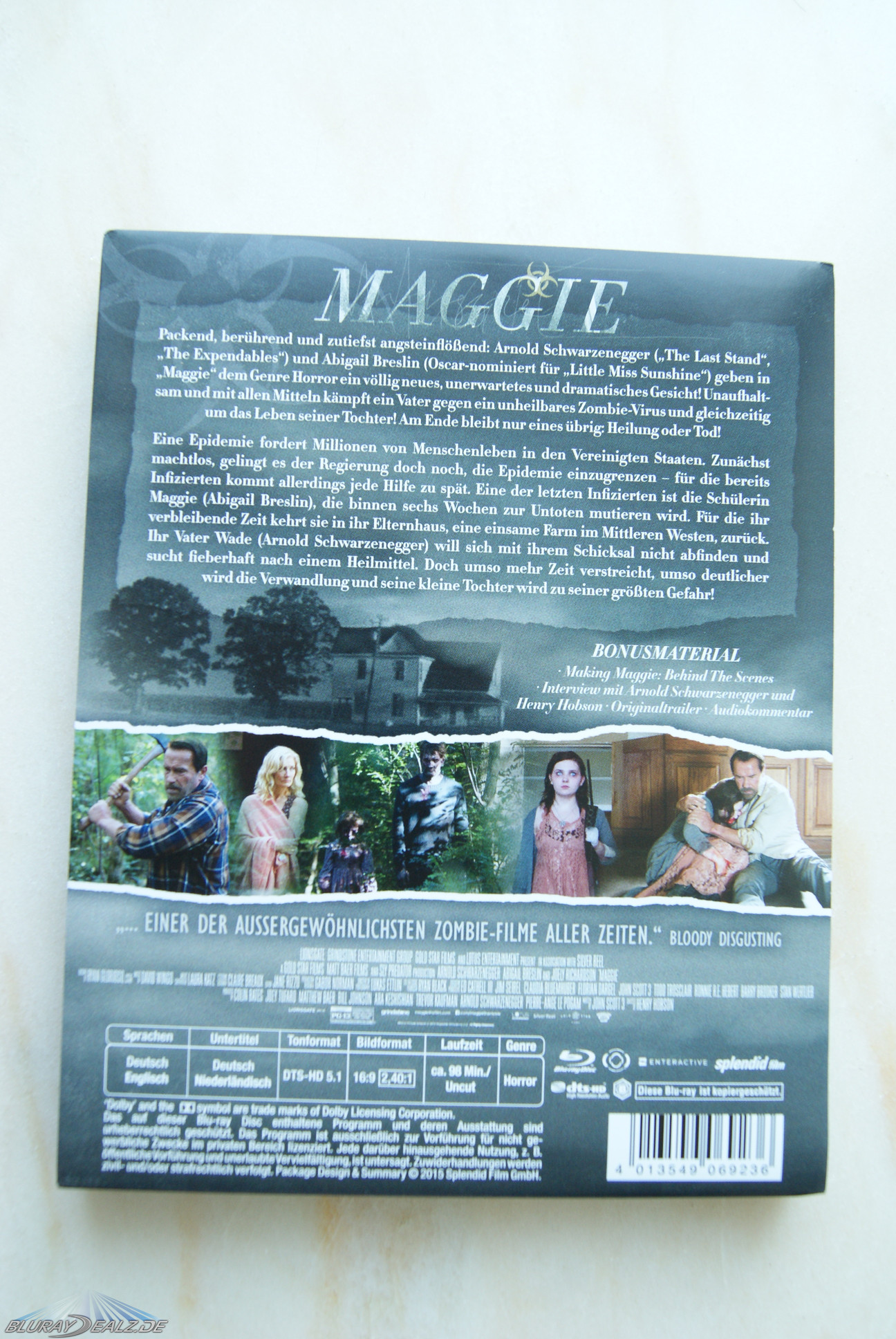 Der Film ist nach „End of Days“ der zweite Horrorfilm mit Arnold Schwarzenegger. In weiteren Rollen sind Joely Richardson und Abigail Breslin zu sehen. Breslin spielt dabei die titelgebende Figur Maggie. Für diese Rolle war anfänglich Chloe Grace Moretz geplant, die aber leider aus terminlichen Gründen für die Rolle absagen musste. „Maggie“ war in Deutschland nicht im Kino zu sehen. Erscheinungsdatum war der 28. August 2015. Die FSK-Freigabe wurde lange mit „ab 18“ angeben, relativ frühzeitig wurde diese jedoch schon auf „ab 16“ heruntergestuft. Aufgrund diverser FSK18-Trailer, die auf der Disc sind, hat diese Veröffentlichung jedoch trotzdem nur eine FSK18-Freigabe. Zum Release kostete das hier betrachtete Steelbook aus dem Hause „Splendid“ ca. 20€.