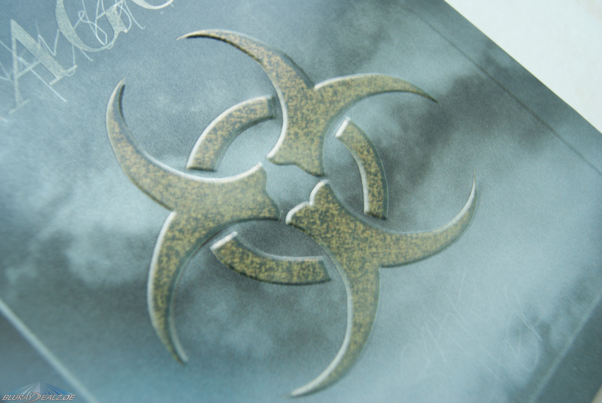 Der zentraler Blickfang des Frontcovers ist mit Sicherheit das geprägte und in beige-grau-anthrazit gehaltene Biohazard-Symbol. Es ist nicht durchgehend in einer der Farben, sondern weist diversen Flecken auf. Dies lässt das Symbol alt und benutzt erscheinen. Der Rand ist silbergrau und sorgt dafür, dass es sich noch mehr von Rest des Covers abhebt. Sehr schön.