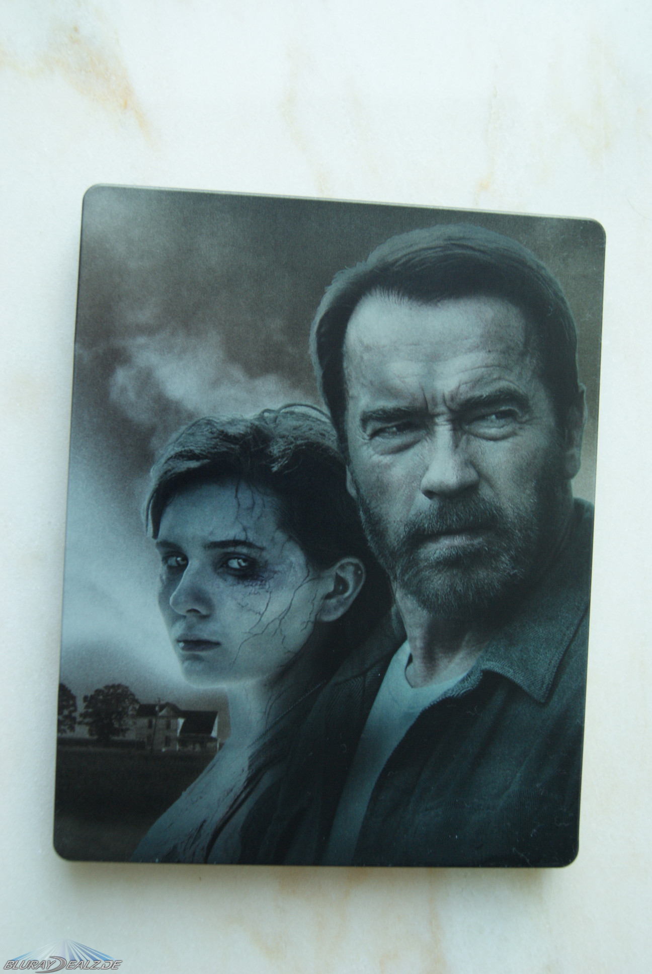 Das Backcover zeigt in den gleichen gedeckten Farben das bekannte Cover der Amaray mit Arnold Schwarzenegger als „Wade“ auf der rechten und Abigail Breslin als bereits fortgeschritten verwandelte „Maggie“ auf der linken Seite. Links neben Breslin ist noch das Haus zu sehen, in dem Wade mit seiner Familie wohnt. Dieses und insbesondere das helle Gesicht von Maggie weisen leichte Glanzeffekte auf. Am hervorstechendsten sind dabei die Augen Maggies, die das Licht sehr stark reflektieren und je nach Lichteinfall einen leichten Blauschimmer haben. Positiv zu vermerken ist die Absenz jedweden Textes.