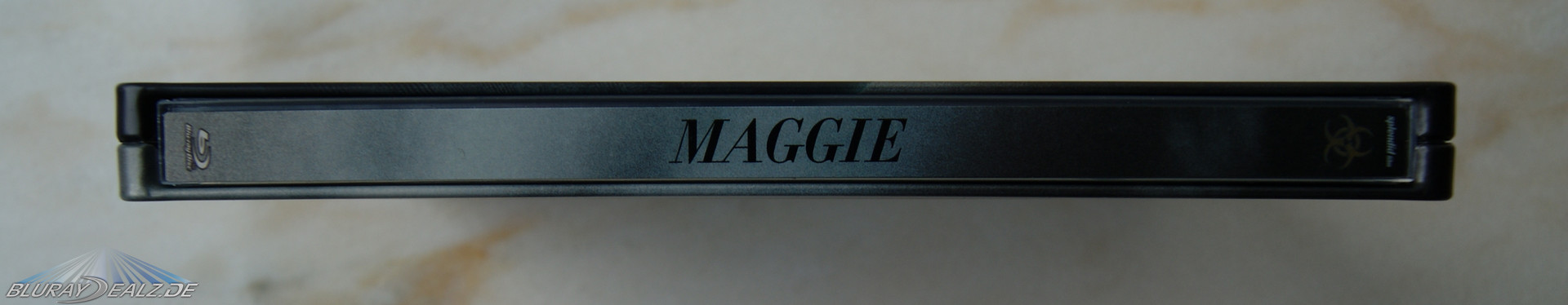 Auf dem Spine sieht man das Motiv des/r durchziehenden Nebels/Wolken von der Vorderseite fortgesetzt, das fast den kompletten Spine ausmacht. Der Titel „Maggie“ ist von unten nach oben geschrieben. Unter dem klitzekleinen Splendid-Schriftzug an der oberen Seite ist noch mal das Biohazard-Symbol von der Frontseite abgebildet. Sieht schön aus. Die obere und untere sowie die Verschlussseite des Steelbooks setzen die Farben des Front- und Backcovers fort. Der Verschluss funktioniert tadellos.