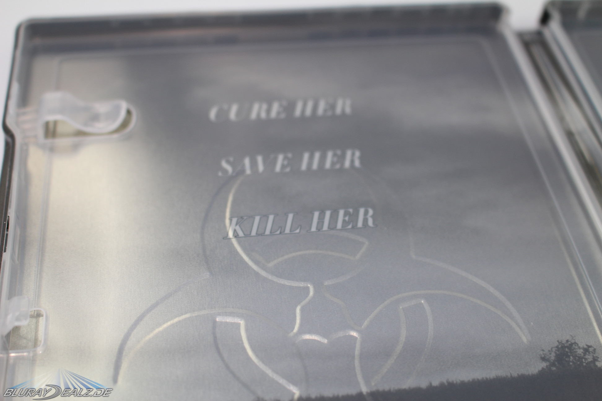 Das Cover sonst ist in anthrazit-grau (oberer Bereich) bzw. in gedecktem Weiß (unterer Bereich, Nebel/Wolken) gehalten. Es ist matt, hat dabei aber etwas Edles mit leichtem Glanz . Der Titel des Filmes steht oben, dahinter und je nach Lichteinfall auf das Cover scheinbar auch davor stehen einige handschriftliche, für mich leider nicht erkennbare Worte. Diese wirken wie in das Steel eingekratzt, sind es aber natürlich nicht. In der gleichen Schrift steht im unteren Bereich mitten im Nebel/in den Wolken „SAVE HER“. Ebenfalls nur sehr schwer zu erkennen – wirkt aber wirklich gut.