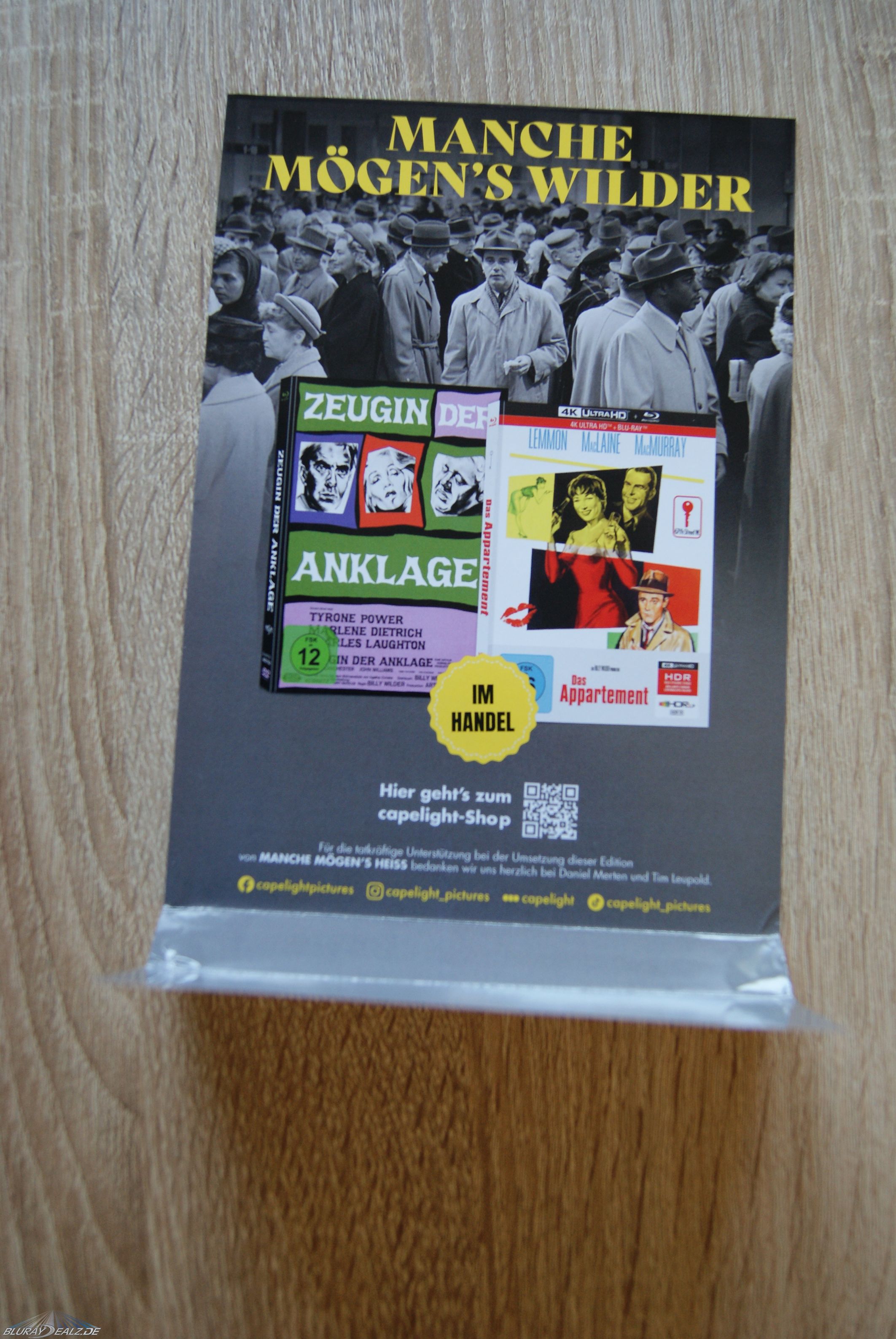 Das Mediabook ist von einer lose umliegenden J-Card umgeben. Etwas ungewöhnlich, da die 4k-Mediabooks von Capelight sonst eher mit einer C-Card ausgestattet sind. Auf der Rückseite finden sich hier die üblichen Angaben wir Inhalt, Bonus und Specs – vorne ist der FSK-Flatschen. Auf der Innenseite sehen wir Werbung für die beiden anderen Billy-Wilder-Filme im Capelight Mediabook „Das Apartment“ und „Zeugin der Anklage“.