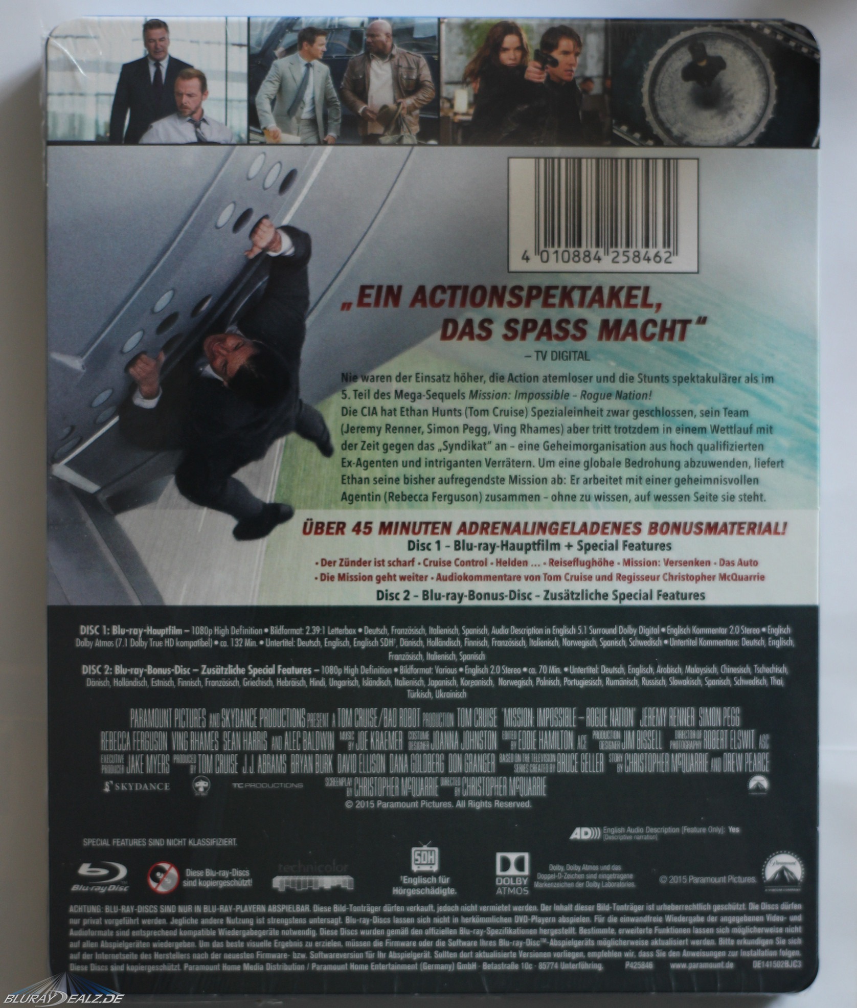 Das Backartwork selbst ist simpel gehalten und zeigt das IMF-Logo auf einer Wand, welches einen stark ausgeprägten Schimmereffekt an den Tag legt. Ich finde das Artwork sehr gelungen, da es den Fokus wie der Film mehr auf den IMF richtet und nicht nur eine willkürliche Szene aus dem Film bietet, was meines Erachtens auch in der Kombination mit dem Frontartwork sehr gut wirkt. Am unteren Rand befinden sich die üblichen Studiologos, welche sich aber erfreulich zurückhaltend ins Artwork integrieren.