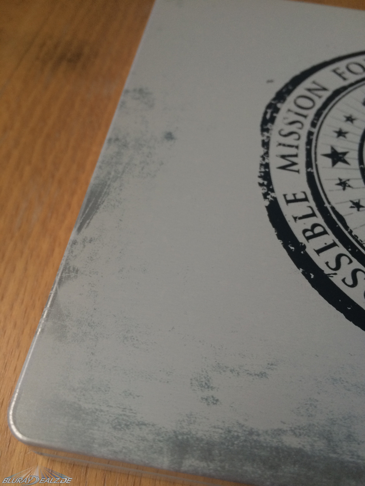 Die Front des Steelbooks ist ein echter Hingucker geworden und ohne Frage das Highlight schlechthin. So zeigt es Tom Cruises Ethan Hunt vor einer nebligen Stadtkulisse in partiellem Hochglanz (Spot Gloss), während der Hintergrund ein hochwertiges, mattes Finish aufweist. Hierbei ist auffällig wie gut der Druck des Steelbooks ist, der sich wirklich durch seine ausgezeichnete Qualität sehen lassen kann. Zudem besitzt der Titel einen leichten Glanzeffekt, was nur davon getoppt wird, dass „Mission: Impossible“ extrem wertig debossed (nach innen geprägt) ist. Hier kann man nur die Höchstnote vergeben.