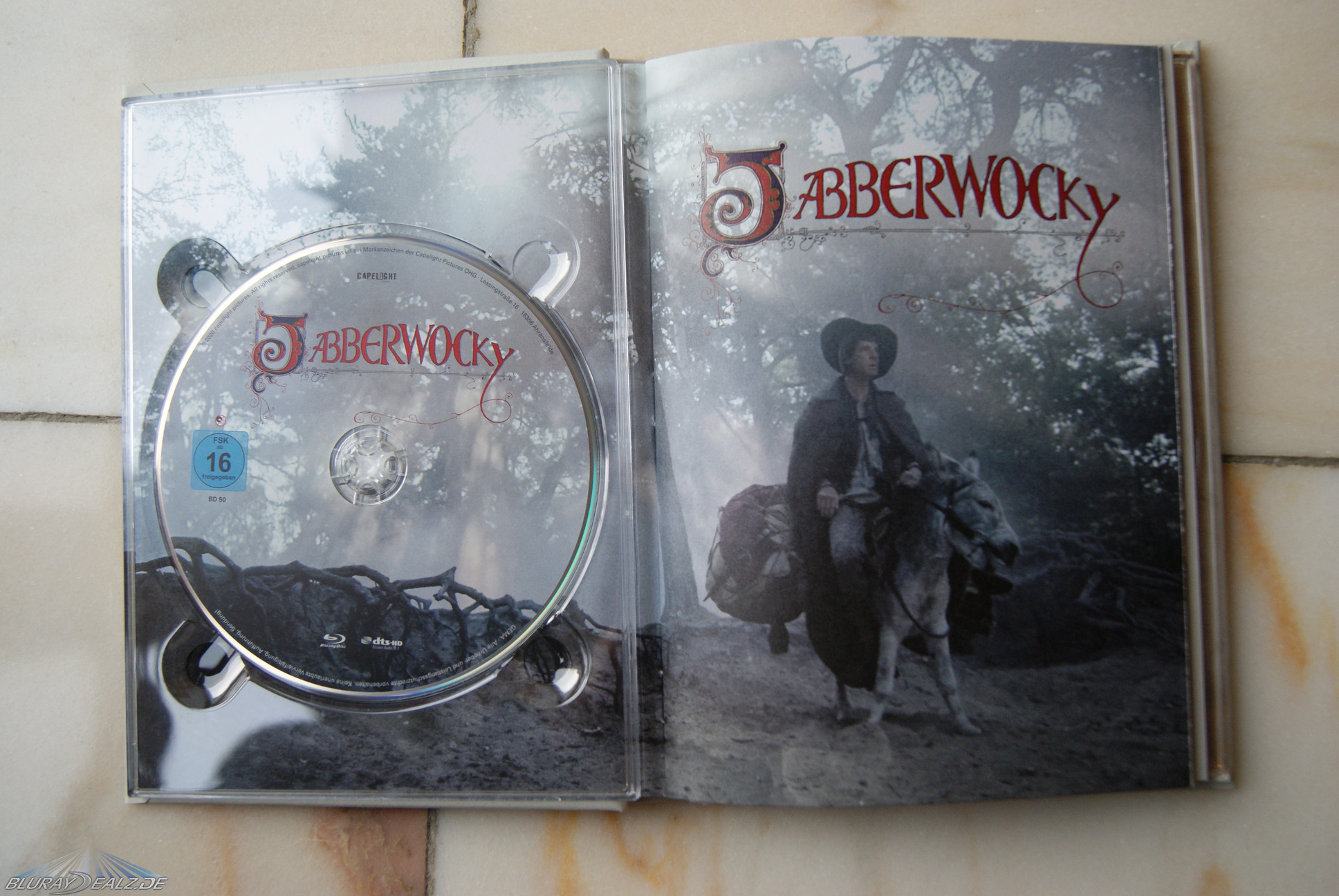 Ihnen finden wir wie gewohnt auf der linken Seite die Blu-ray und auf der rechten Seite die DVD. Beide fügen sich wie in den letzten Capelight Mediabooks auch mit Ihrem Motiv wunderbar in den dahinterliegenden Tray Hintergrund ein. Besonders auf der Blu-ray Seite sieht dies diesmal absolut fantastisch aus. Der Tray Hintergrund bildet mit der ersten Seite des Booklets ein wunderschönes Gesamtmotiv, das wirklich seinesgleichen sucht. Das gleiche gilt auch für die Rückseite, hier allerdings finden wir eine pergamentartige Oberfläche bzw. Motiv, so dass die Disc und auch die Doppelseite eher unspektakulär daher kommen. Sehr schön ist der Umstand, dass auf der letzten Seite des Booklets das Original Jabberwocky Gedicht abgedruckt ist. Das Booklet selber geht wie gewohnt über 24 Seiten, enthält viele Bilder aus dem Film und ist von hochwertiger Verarbeitung. Der Text stammt von Frank Arnold.