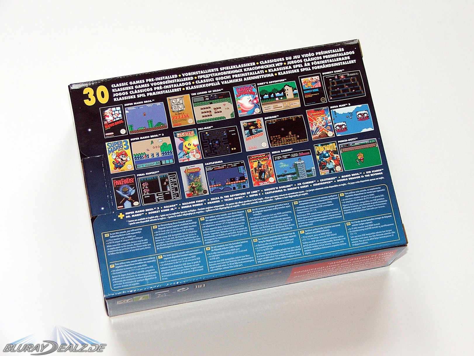 Das Mini NES ist deutlich kleiner als das Original und passt in einer Hand. Schon richtig putzig das kleine Teil. Wie ein kleines Modellauto. Nur dass es eben eine Konsole ist. Der Controller ist glücklicherweise nicht geschrumpft und in jeder Hinsicht dem Original nachempfunden worden. Wer will, kann auch den Controller für die Wii Remote benutzen und somit seine VirtualConsole-Spiele auf der Wii und WiiU spielen. Andersrum ist es natürlich auch möglich, einen Wii Classic Controller für den Mini NES zu verwenden. Insgesamt sind 30 recht hochwertige Spiele auf der Konsole installiert und jedes Spiel verfügt über 4 Speicherplätze, welches sich bequem über der Reset-Taste abspeichern und zu einem späteren Zeitpunkt wieder fortsetzen lässt.