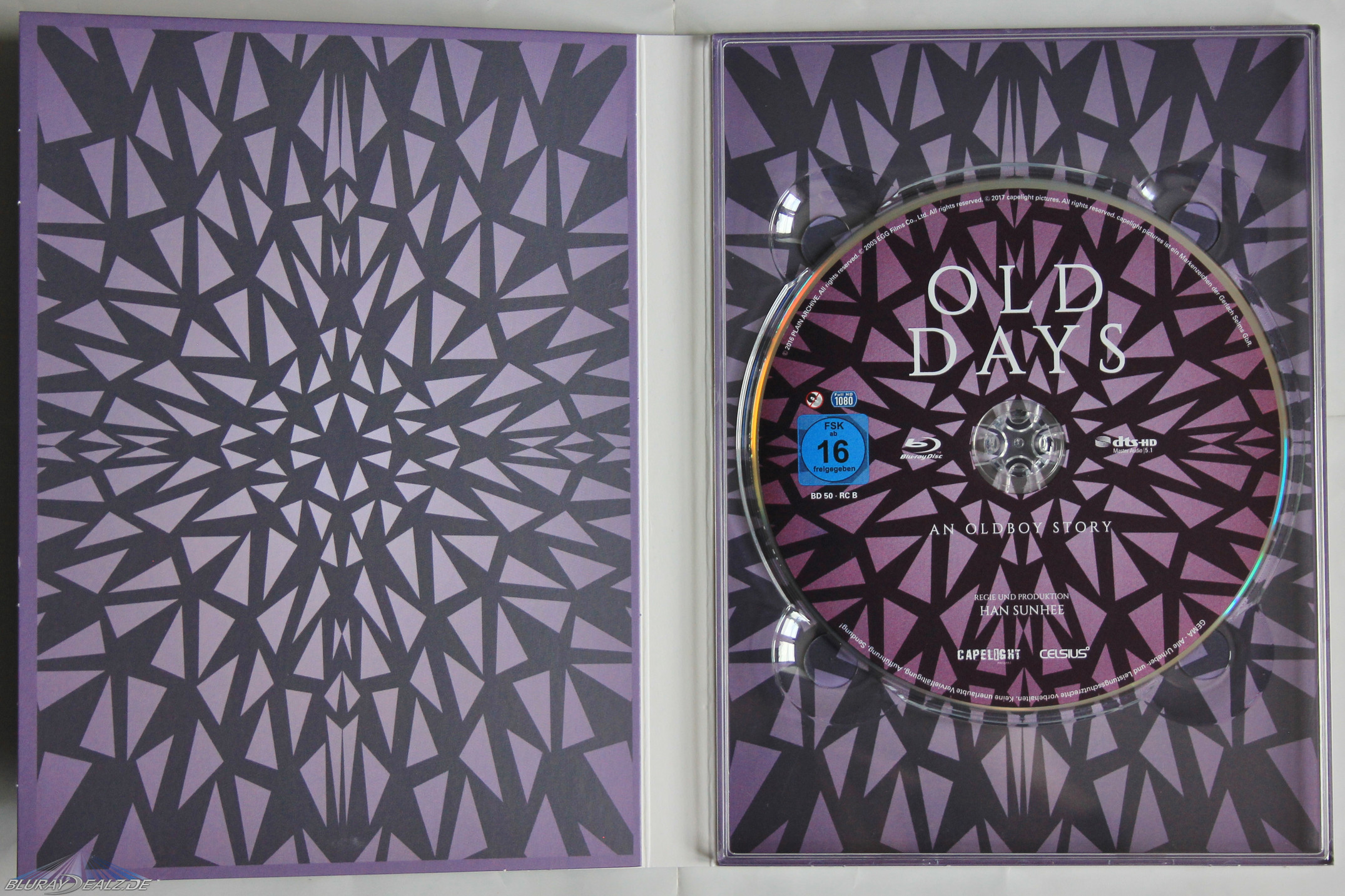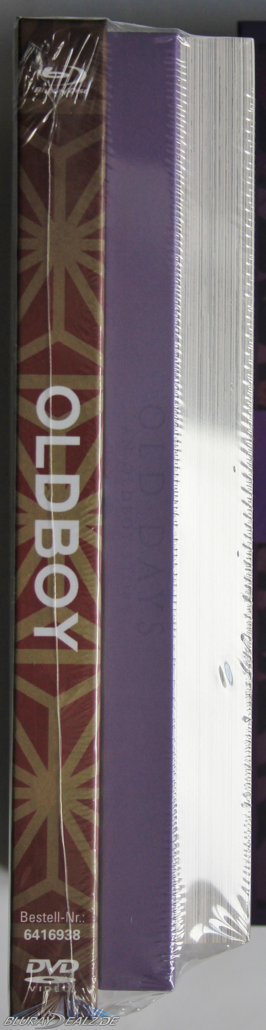 Als nächstes folgt die Hauptursache für die zweiwöchige Verschiebung des Releases: das Digipack. Dieses präsentiert das bekannte Boxmotiv, diesmal in matt gehalten. Man könnte denken, damit hat es sich. Weit gefehlt: neigt man das Digipack leicht im Licht, so offenbart sich der bis dato fast unsichtbare Titelschriftzug in hochwertiger Glanzschrift: „Old Days – An Oldboy Story“. Ein echter Hingucker-Effekt! Auch auf dem Spine befindet sich diese Glanzschrift mit selbigem Titel. Top.
