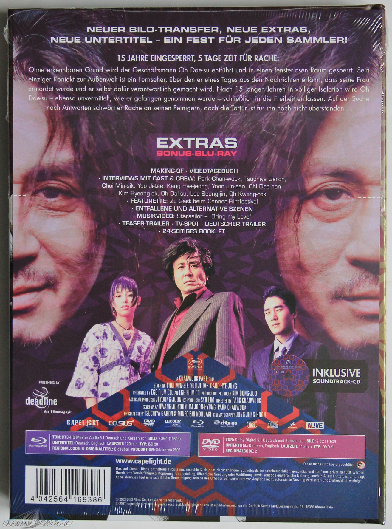 Zwei Wochen später als eigentlich angekündigt hat es die lange angekündigte Ultimate Edition von „Oldboy“ nach ein paar Lizenz- und Produktionsschwierigkeiten nun endlich in die Verkaufsregale geschafft. Ihr vorangegangen sind zudem ein Steelbook und das ebenfalls in dieser Box enthaltene Mediabook. Die tolle Nachricht: Capelight präsentiert die von Plain Archive unter Aufsicht von Park Chan-wook restaurierte Bildfassung des 2003 veröffentlichten Kultfilms aus Südkorea, inklusive deutscher und englischer Untertitel. Aber auch das geheime Highlight, welches die Editionen von Plain Archive für Sammler so interessant machte, hat sich Capelight gesichert und legt es exklusiv dieser Ultimate Edition bei: die extra angefertigte Dokumentation über die Entstehung und Produktion des Films: „Old Days“. Die Doku weist dabei eine Laufzeit von 111 Minuten auf und ist jedem Fan ans Herz zu legen. Wer wissen will, wie eine demokratische Abstimmung über Schlafzeiten und die besonderen Produktionsschwierigkeiten rund um den Film aussehen, wird hier bestens mit Informationen und On-Set-Eindrücken versorgt. Das Ganze wird als OmU-Fassung präsentiert und ist auf Disc 5 des Sets enthalten.