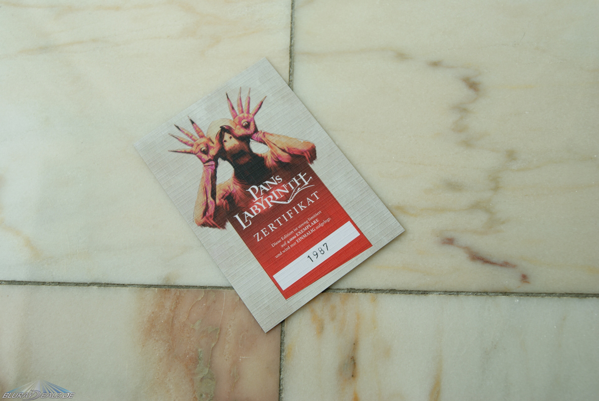 Der Zertifikat ist ca. 10,5*14,5cm groß und beidseitig bedruckt. Es ist doppelseitig auf festem, schon strukturierten und geprägtem Karton bedruckt und gibt auf der Vorderseite die Limitierungsnummer an (Auflage insgesamt: 4.000)