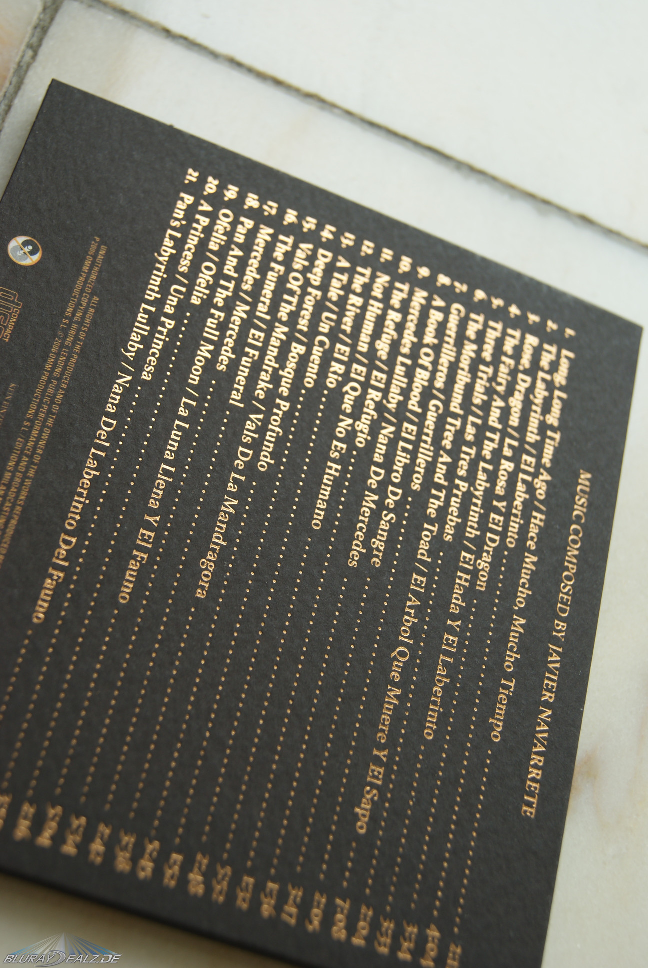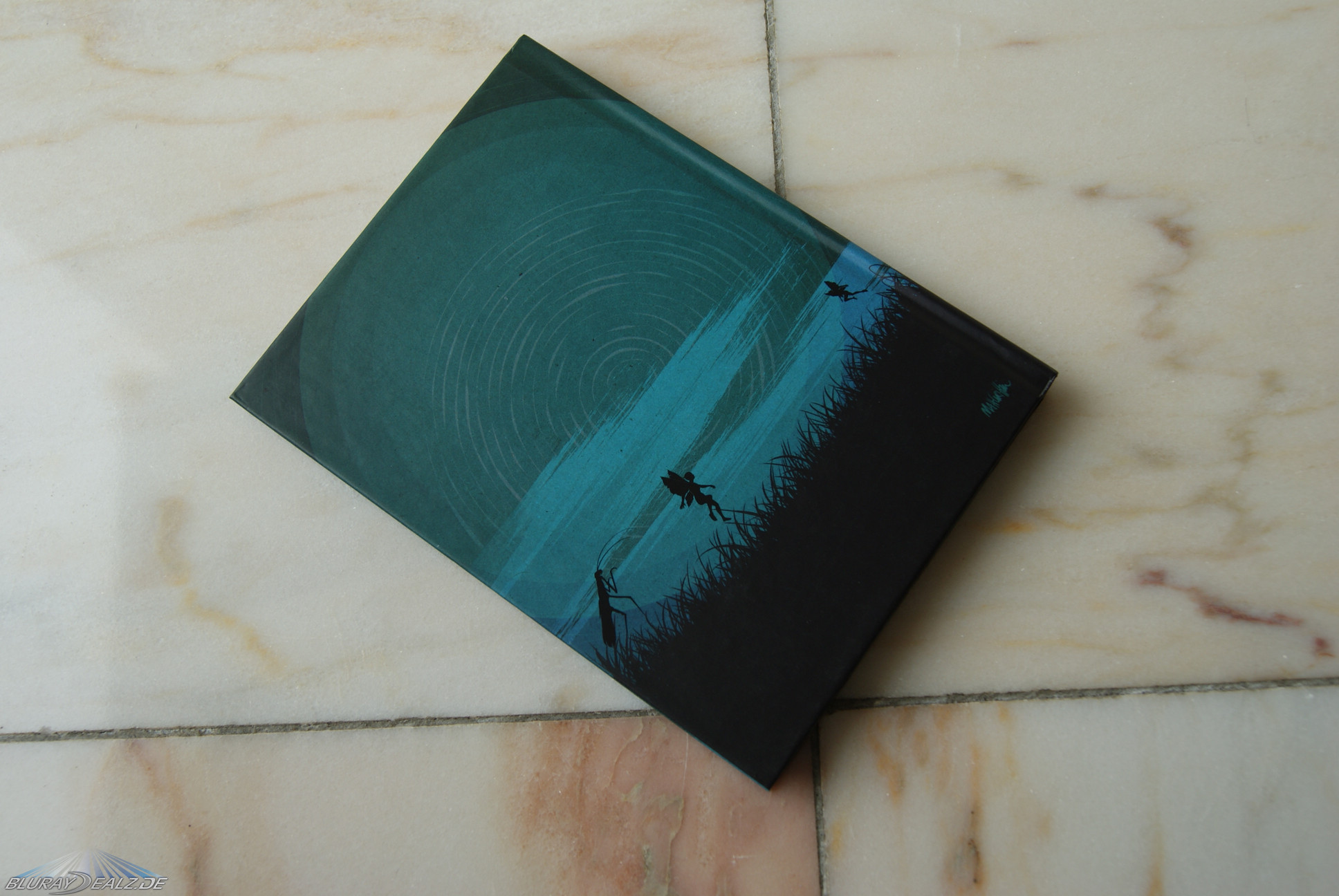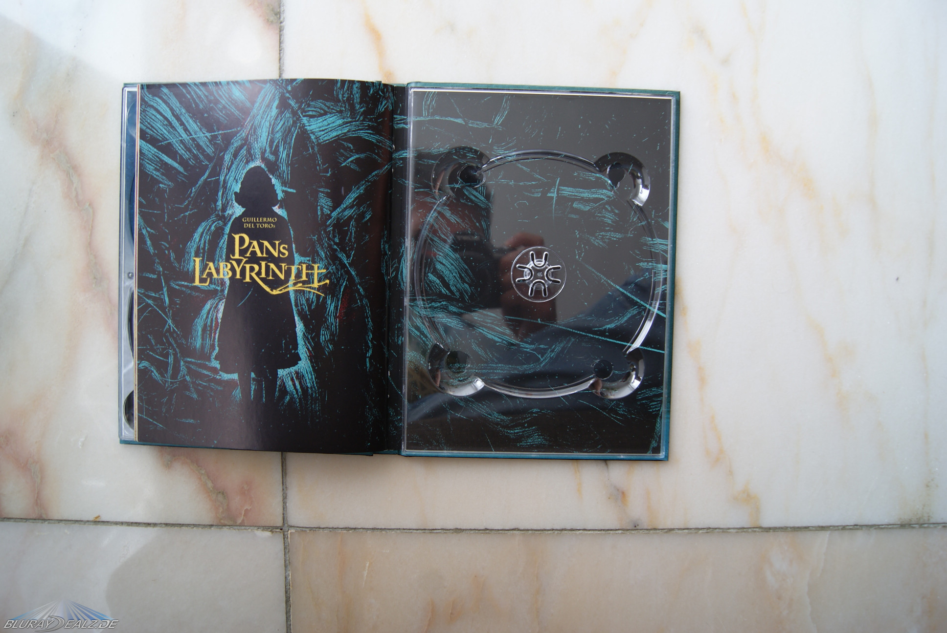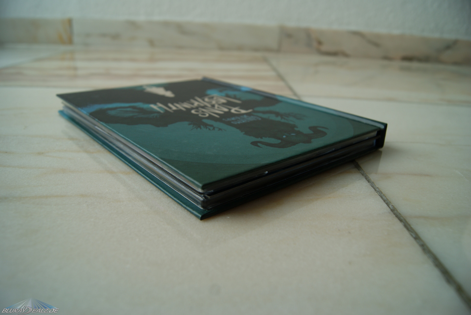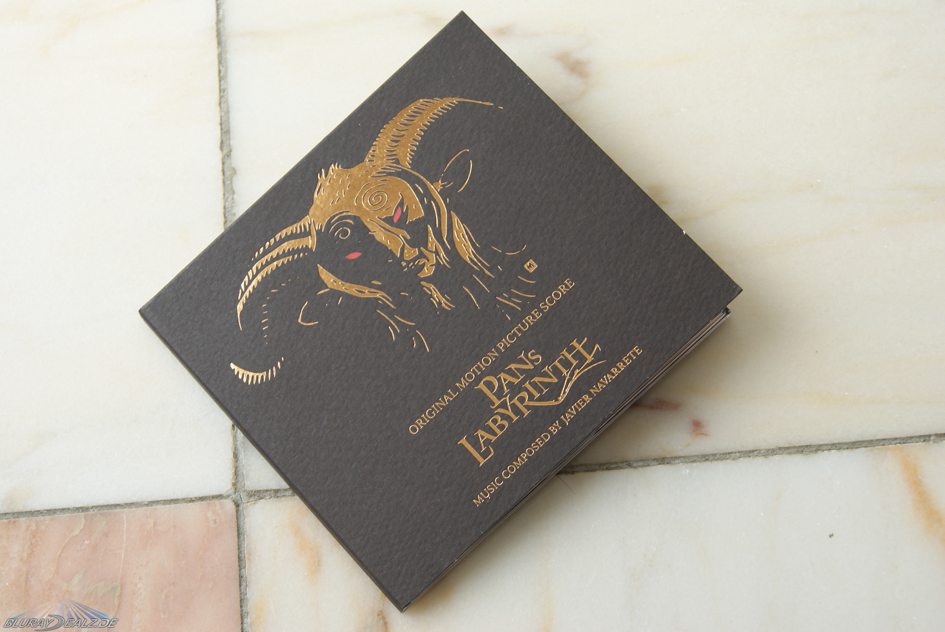 Das Motiv (übrigens weltexklusiv für dies Edition von Künstler Matthew Griffin exklusiv für das Mediabook entworfen) stand doch seit Veröffentlichung des Bildes etwas in der Kritik (auch bei mir). Doch in natura macht es wirklich einiges her. Insbesondere durch die Mischung der dunklen Farbtöne (Schwarz, grün und blau) und dem wunderbar eingesetzten Spotlack auf dem matten Untergrund. Dieser Lack findet sich wieder in Ofelias Figur, im Titel und Namen des Regisseurs (wirkt hierdurch fast eine kleine Prägung) und in den Augen Pans – die somit im Licht wunderbar lebendig wirken.