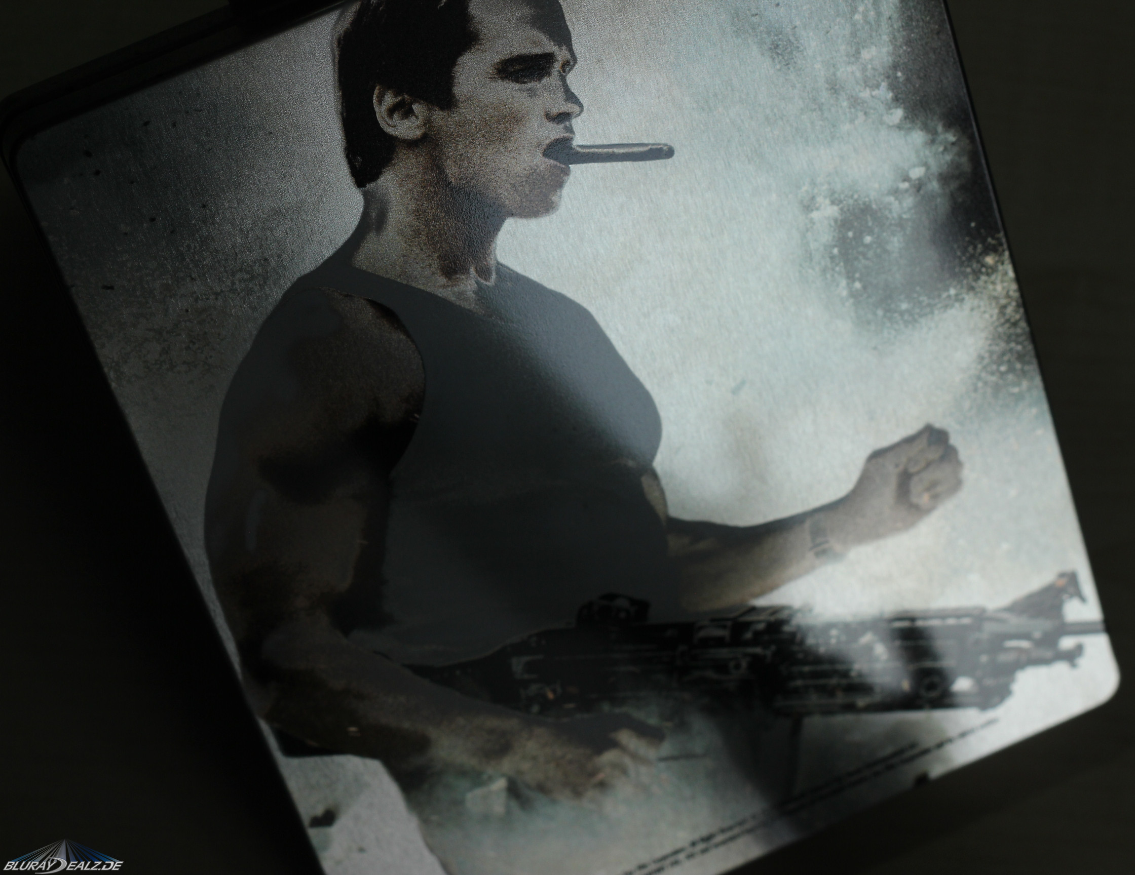 Der Druck hingegen ist ein zweischneidiges Schwert: zum Einen ist er sehr kräftig, allerdings ist er ebenfalls leicht unscharf, was wohl am gewählten Artwork (Movie-Still) liegen und auch nicht so unpassend für einen Film aus den 80ern erscheinen mag, dennoch muss das heute nicht mehr sein. Das Zavvi-Steelbook zur Kinofassung hatte hiermit ja auch kein Problem. Aber das ist Meckern auf hohem Niveau, weil das Frontartwork sehr gefällt und bis auf die Photoshop-Debatte (seine linke Hand), die es unweigerlich auslösen wird, einfach ein klassischer Arnie.
