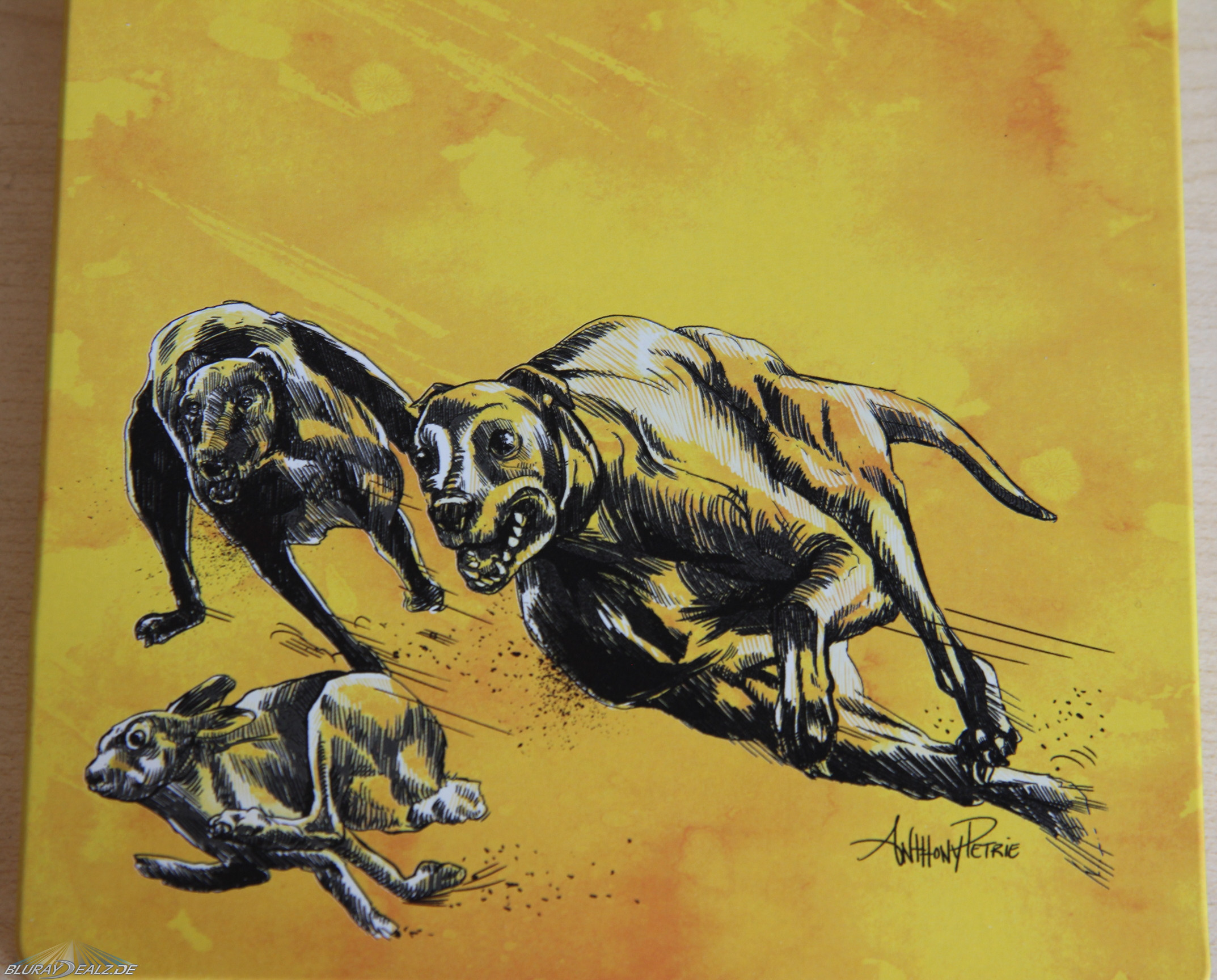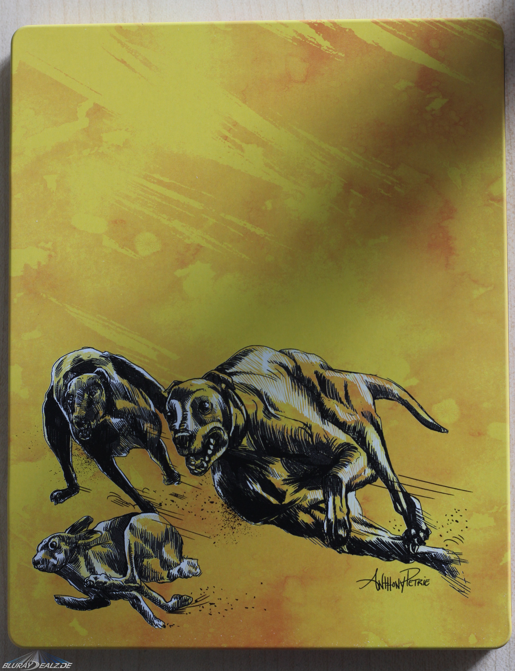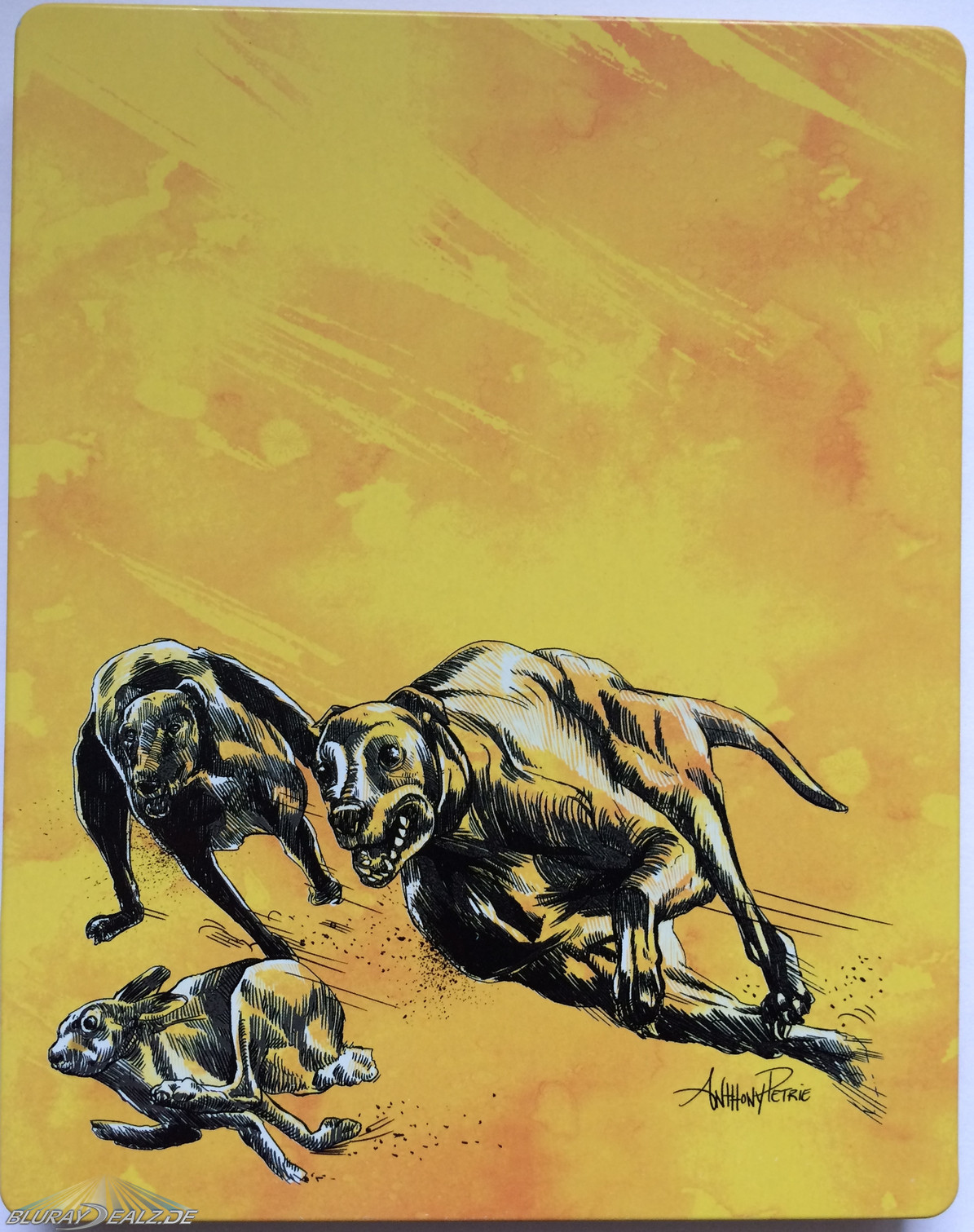 Das Backcover zeigt zwei Jagdhunde die einen Hasen jagen. Dies ist eine Szene des Films, welche eine Analogie zu einem der drei Haupthandlungsstränge darstellt. Außerdem befindet sich auf der Rückseite die Unterschrift des Künstler, der das Design für das jeweilige Steelbook entworfen hat. Das Innere des Steelbooks verfügt leider nicht über einen Innendruck, ebenso wie die anderen Steelbooks der Pop-Art Reihe. Die Innenseite ist bei diesem Steelbook in einem schlichten gold-gelb gehalten. Dies ist zwar schade, aber für einen Preis von 9,99€ bei Release durchaus vertretbar.