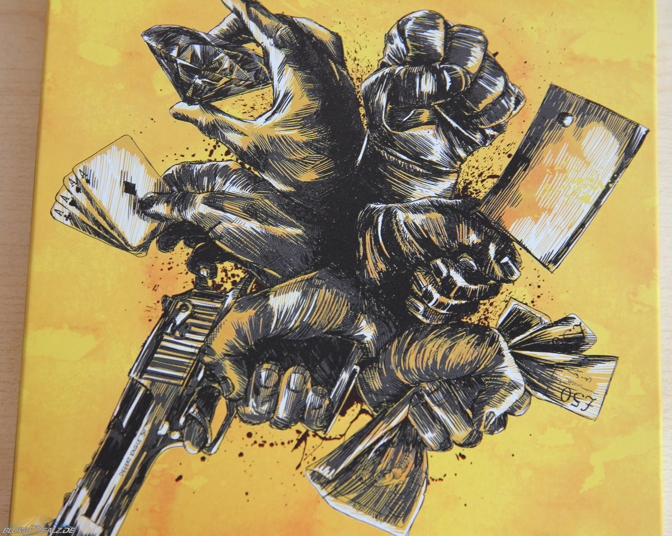 Das Steelbook hat eine matte Optik. Es ist leider nicht geprägt. Das Frontcover zeigt sechs Hände (welche einem gemeinsamen Mittelpunkt entspringen). Die Hände sind mit Geld, Diamanten, Spielkarten, einem Schlachtermesser und einer Pistole haltend dargestellt, welches ein sehr schönes Symbol für den Film mit seinen verschiedenen, dennoch verflochtenen, Handlungssträngen darstellt.
