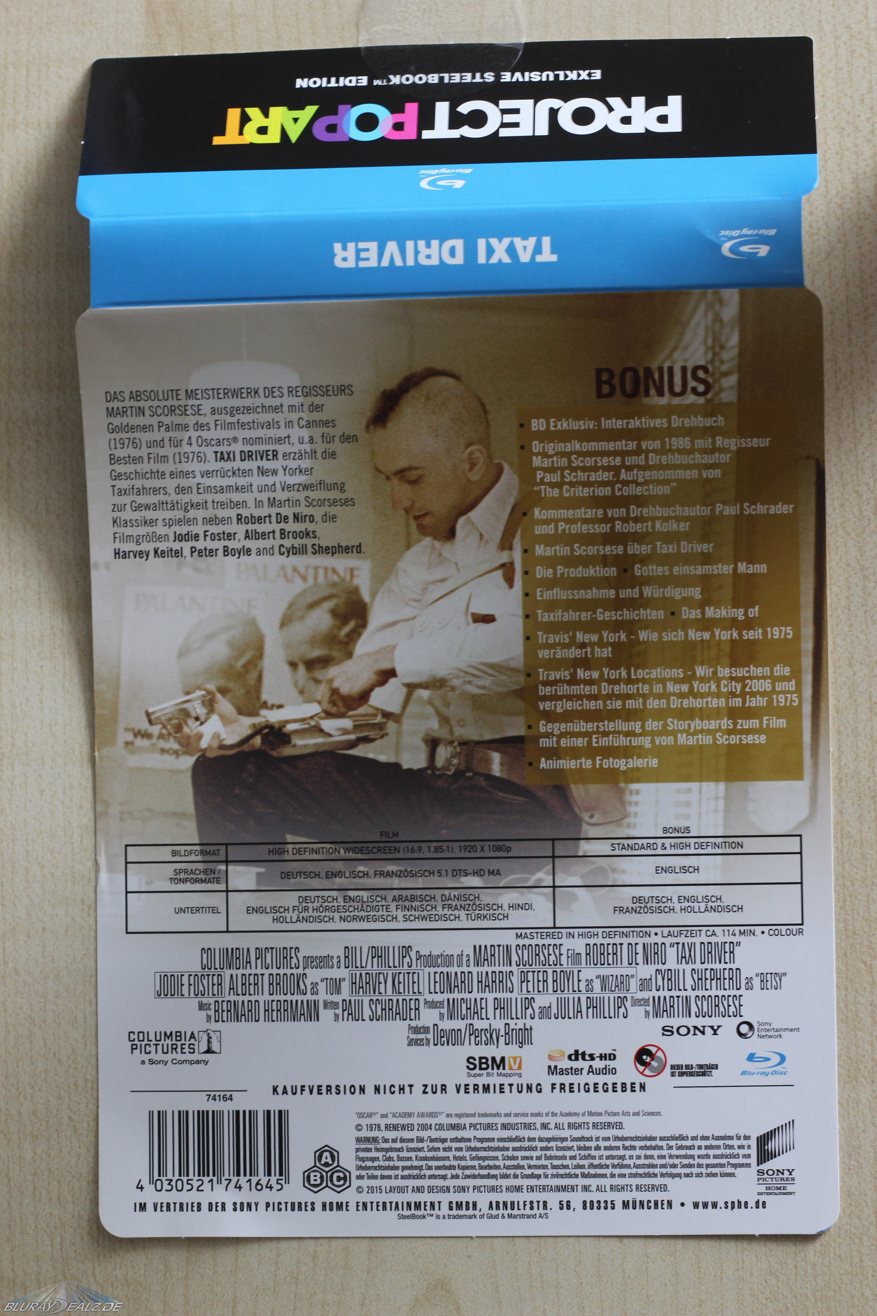 Info für Einheitssammler: Die J-Card beim Taxi Driver-Steelbook ist witzigerweise (wegen dem Titeldruck) nach oben hin geschlossen – im Gegensatz zu den anderen Exemplaren, wo die J-Card nach unten hin geschlossen ist.“