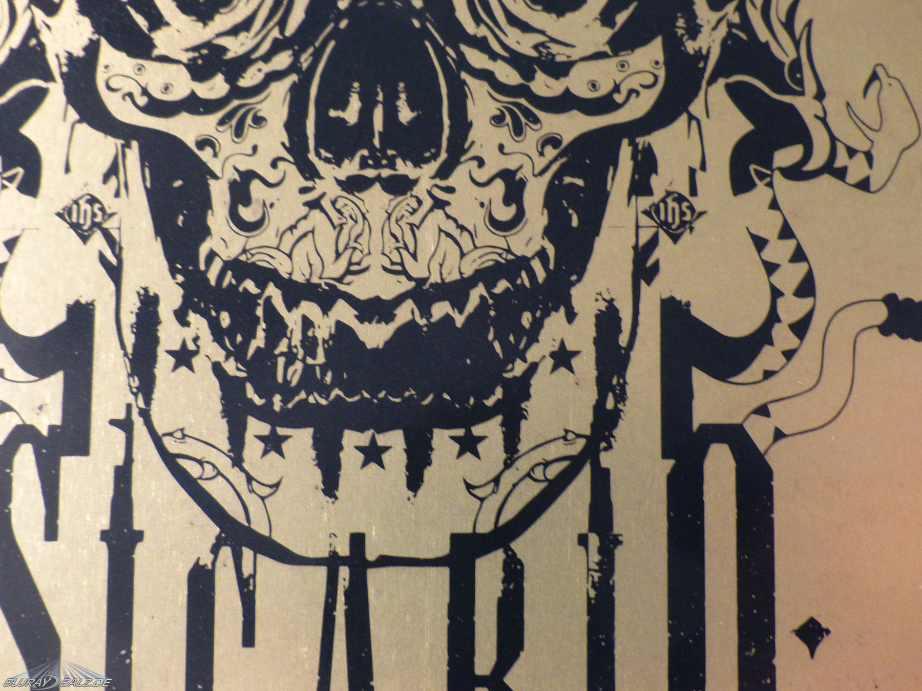 Die Front ist, wie das gesamte Steelbook auch in Gold mit schwarzen Flecken gehalten. Das macht es schmutzig und schön anzusehen. Ähnlich wie beim Steelbook zu „Contagion“. Die Front ziert ein „la calavera“, ein Totenkopf, wie man ihn in Mexiko an dem Tag der Toten zuhauf findet. Der Druck ist sehr kräftig und scharf. Es gibt aber keine Prägung, das wäre in dem Fall nett gewesen, aber auch kein Muss.