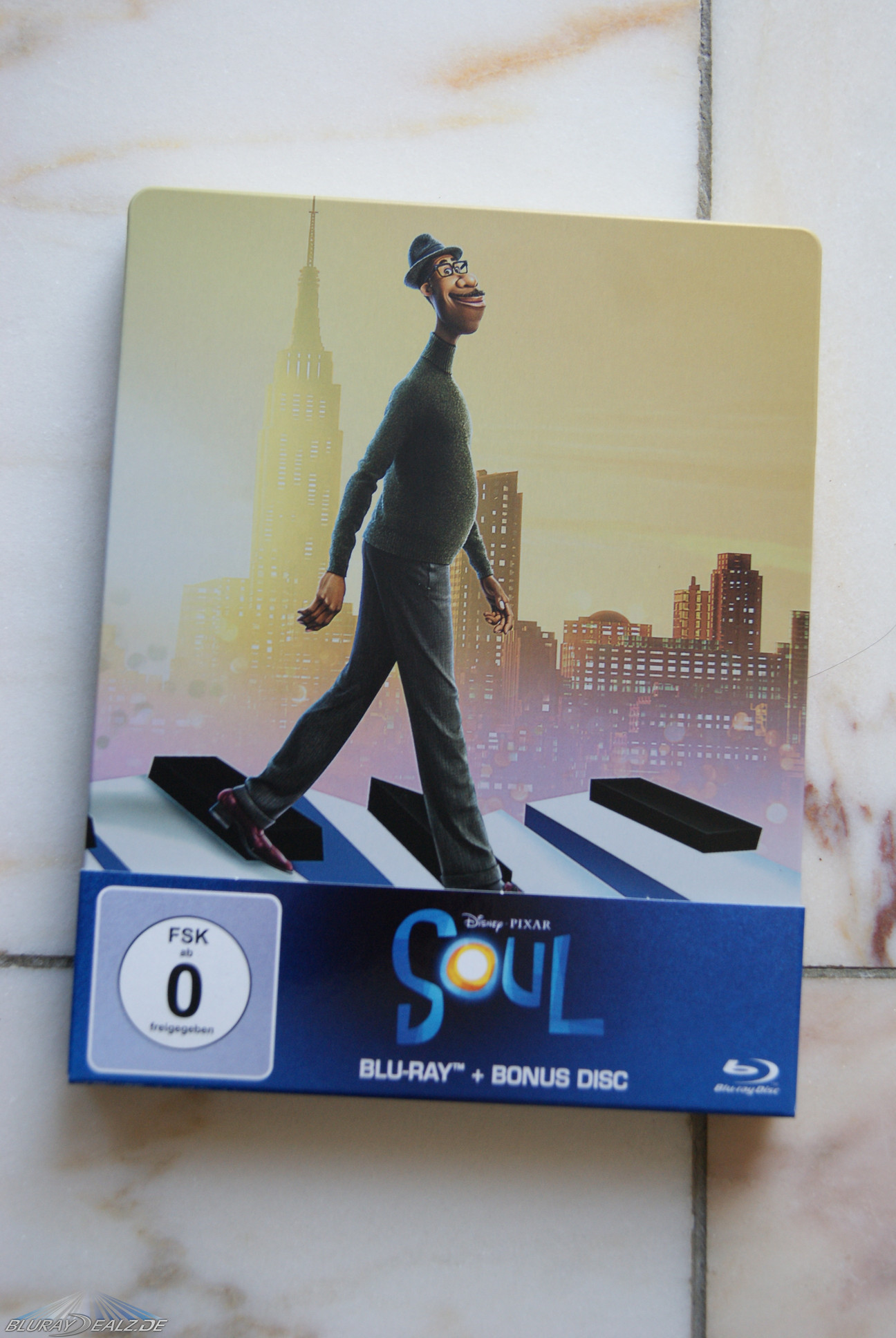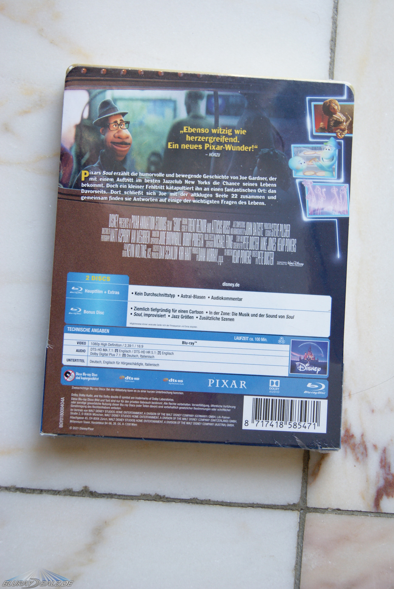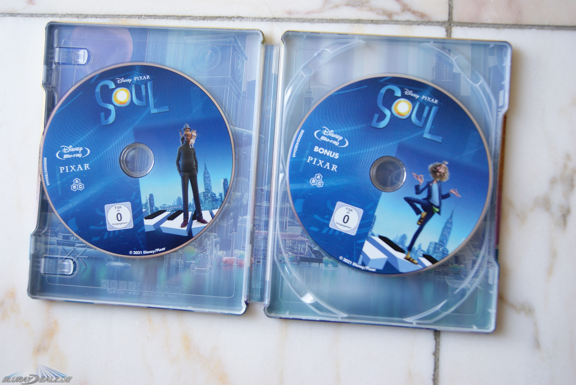 Zwar immer noch Disneymäßig blau, aber nicht mehr nur sind die Discs hier. Beide zeigen einen der Hauptcharaktere und den gewohnt gestalteten Titelschriftzug „Soul“. Ganz nett. Allein der Umstand, dass es eine Bonus Disc gibt, ist natürlich positiv zu vermerken. Entfernt man die Discs, sieht man wie immer bei Disney einen schönen farbigen Innendruck. Der war aber bei anderen VÖs aus dem Hause Disney schon knackiger.