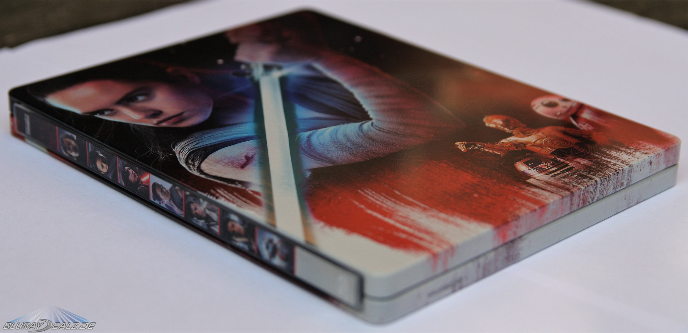 Das Frontcover zeigt Rey in kämpferischer Pose mit einem Laserschwert. Der Hintergrund ist schlicht gehalten und zeigt im oberen Teil den Weltraum mit Sternen/Planeten und im unteren Teil vermutlich einen Teil der roten Mineralwelt von Crait, die mit Salz überzogen ist. In der rechten unteren Ecke sind zudem noch R2-D2, C3PO und BB-08 abgebildet. Dabei ist nahezu das gesamte Frontcover glänzend („glossy“) gehalten, insbesondere das Laserschwert, die Sterne und alles Weitere in metallischen Farben. Dadurch, dass das Steel nahezu komplett glossy gehalten ist, wird der Weltraum-Stil schön herübergebracht. Der damit einhergehende Nachteil ist, dass das Steelbook sehr anfällig für Fingerabdrücke ist. Leider findet sich – wie auch schon beim vorherigen Teil und bei Rogue One – keine Prägung auf dem Steelbook.