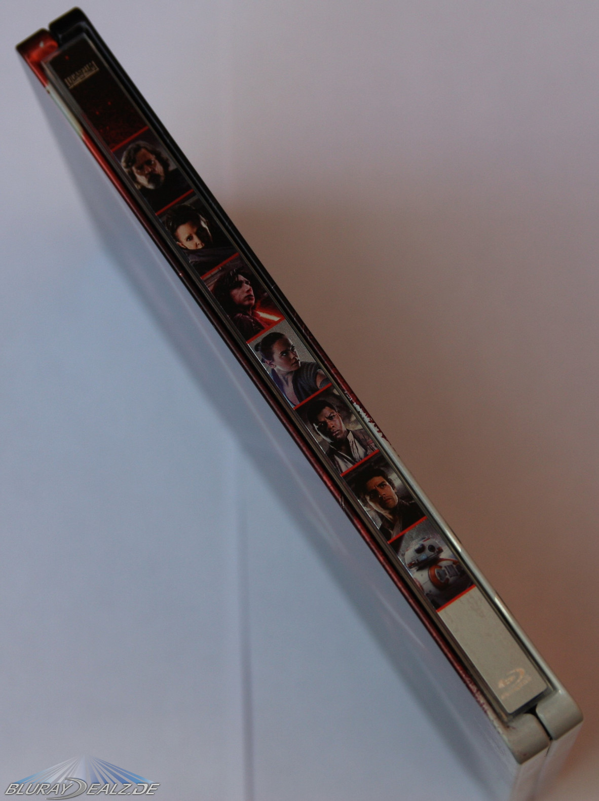 Der Verschluss setzt die Motive von Front- und Backcover fort und bildet daher eine gelungene Verbindung. Das Spine zeigt neben den Logos von Lucasfilm und Blu-ray Disc ™ ähnlich wie bei den Steelbook zu den Marvel-Filmen nicht den Titel, sondern kleine Portraits von den Hauptpersonen. Dies sind in diesem Fall Luke, Leia, nochmals Kylo-Ren und Rey, Finn, Poe und BB-08. Ob man diese Art der Gestaltung gut finden will, ist jedem selbst überlassen. Ich für meinen Teil finde jedoch die Fortführung von Front- und Backcover, in die der Titel auf dem Spine eingebettet ist, sinnvoller. Zumindest farblich wurde hier aber die Gestaltung von Front- und Backcover fortgeführt.