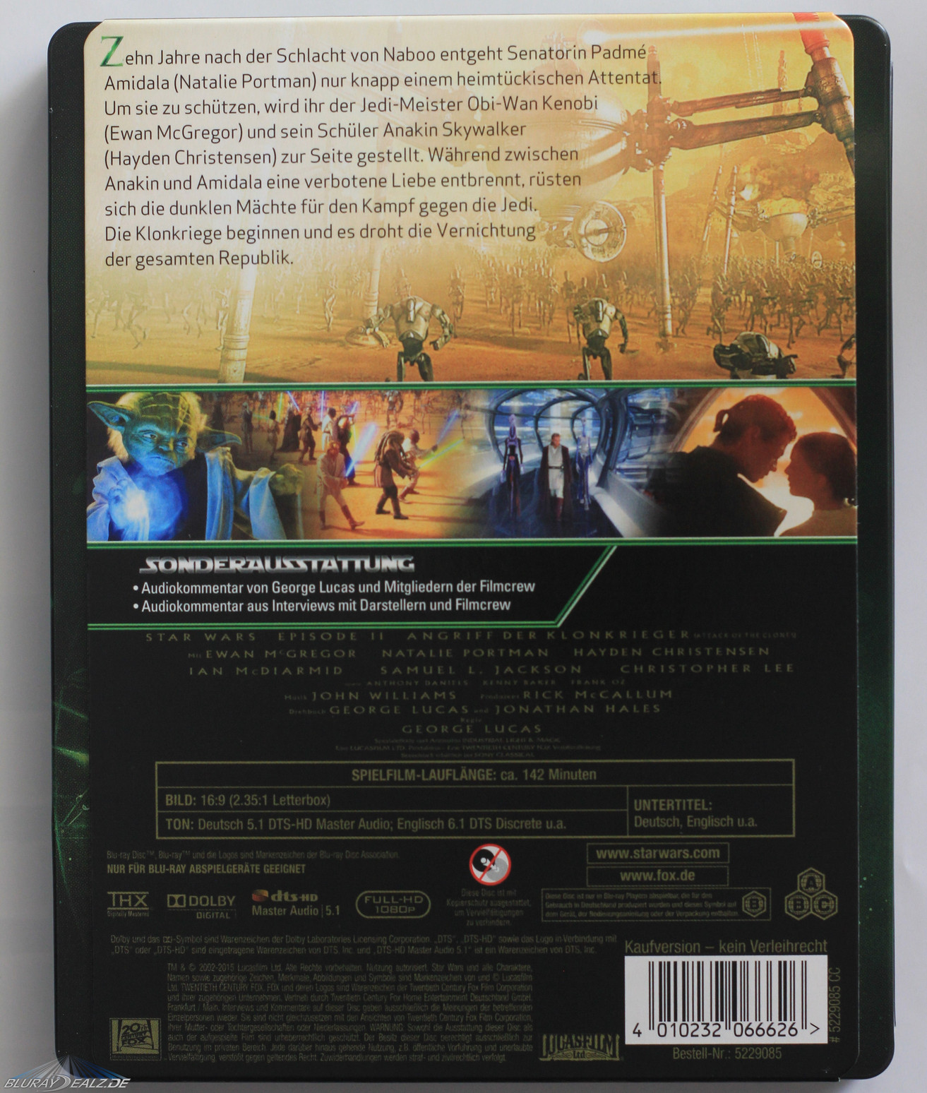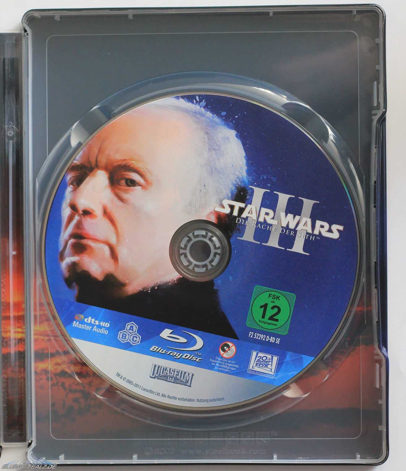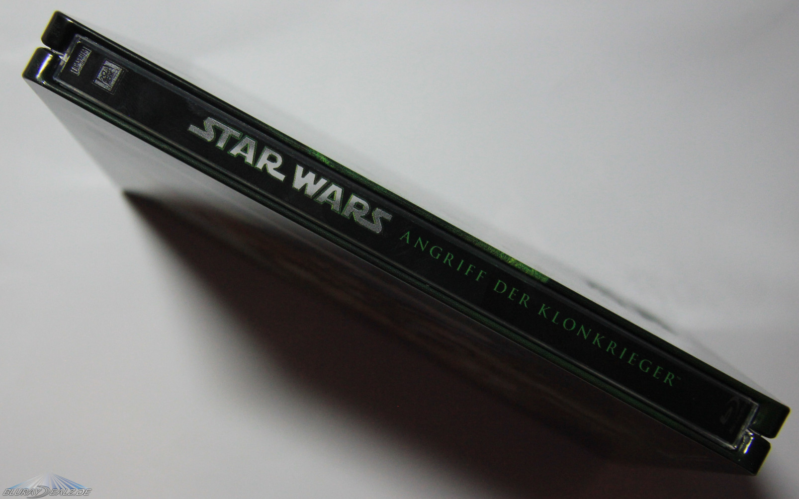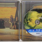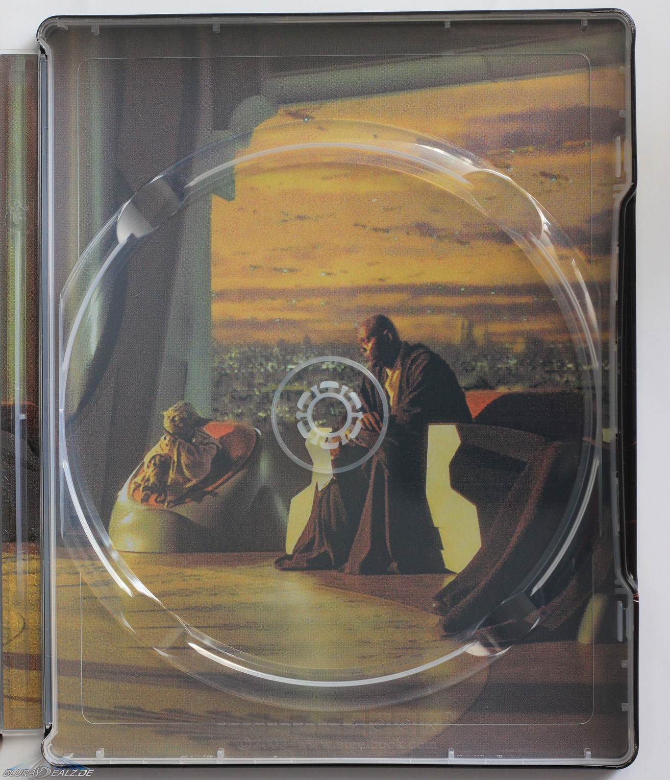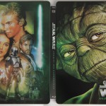 Die Rückseite ist nun ein wahrer Hingucker und offenbart warum diese Steelbooks absolute Highlights sind und in jede Sammlung gehören! Denn jedes Backcover zeigt das jeweilige original Kinoplakat des Films. Eine Traumwahl also für Fans. Auch die Rückseite weist eine sehr leichte wenn auch weniger stark als auf der Vorderseite ausgeprägte Schimmeroptik auf, die einzelne Elemente des Posterartworks betont. Auch dies sieht edel aus, vor allem beim Backartwork von „Die Rache der Sith“ entsteht so ein wahnsinnig toller Betrachtungseffekt. Bestnote!