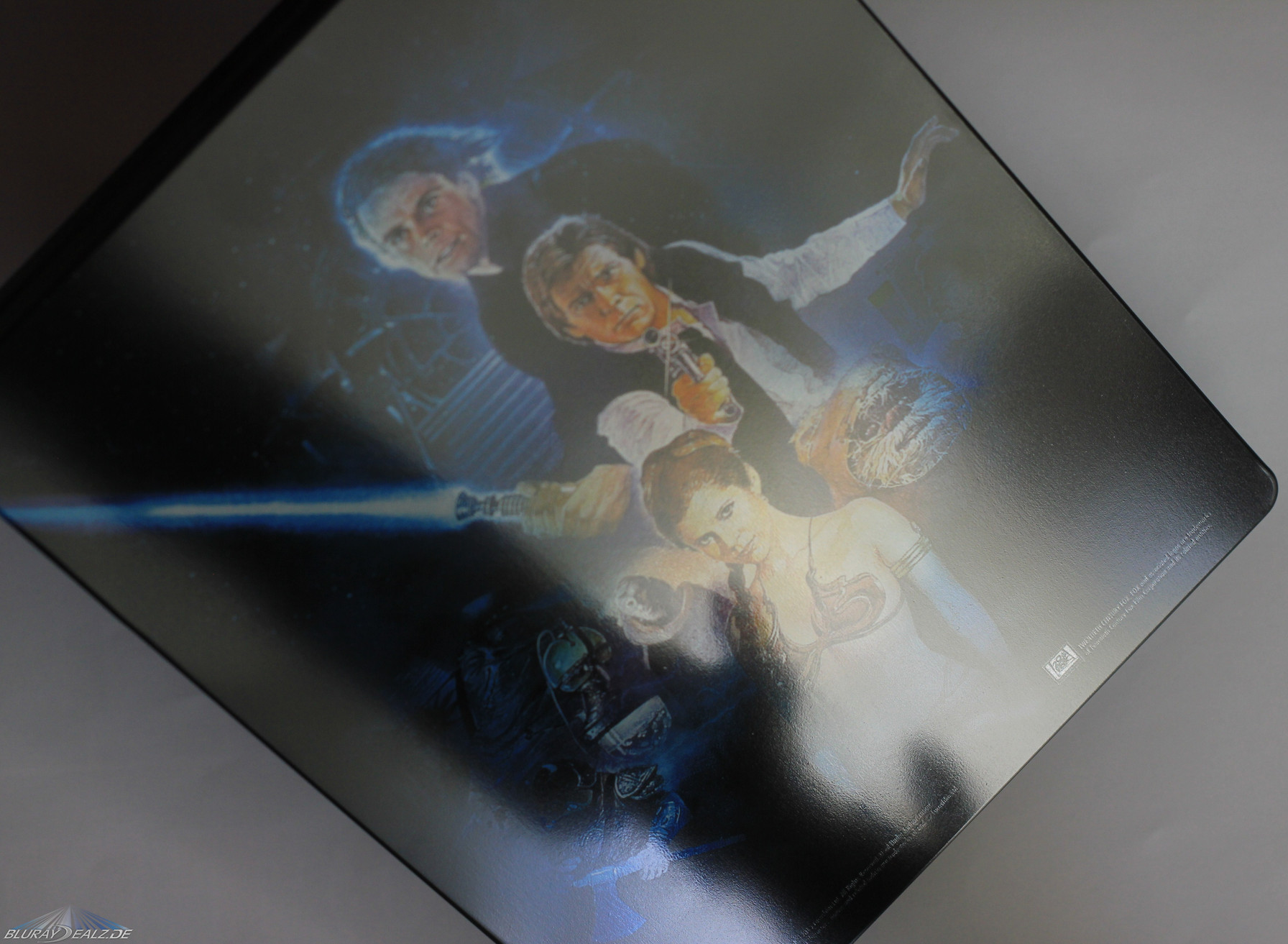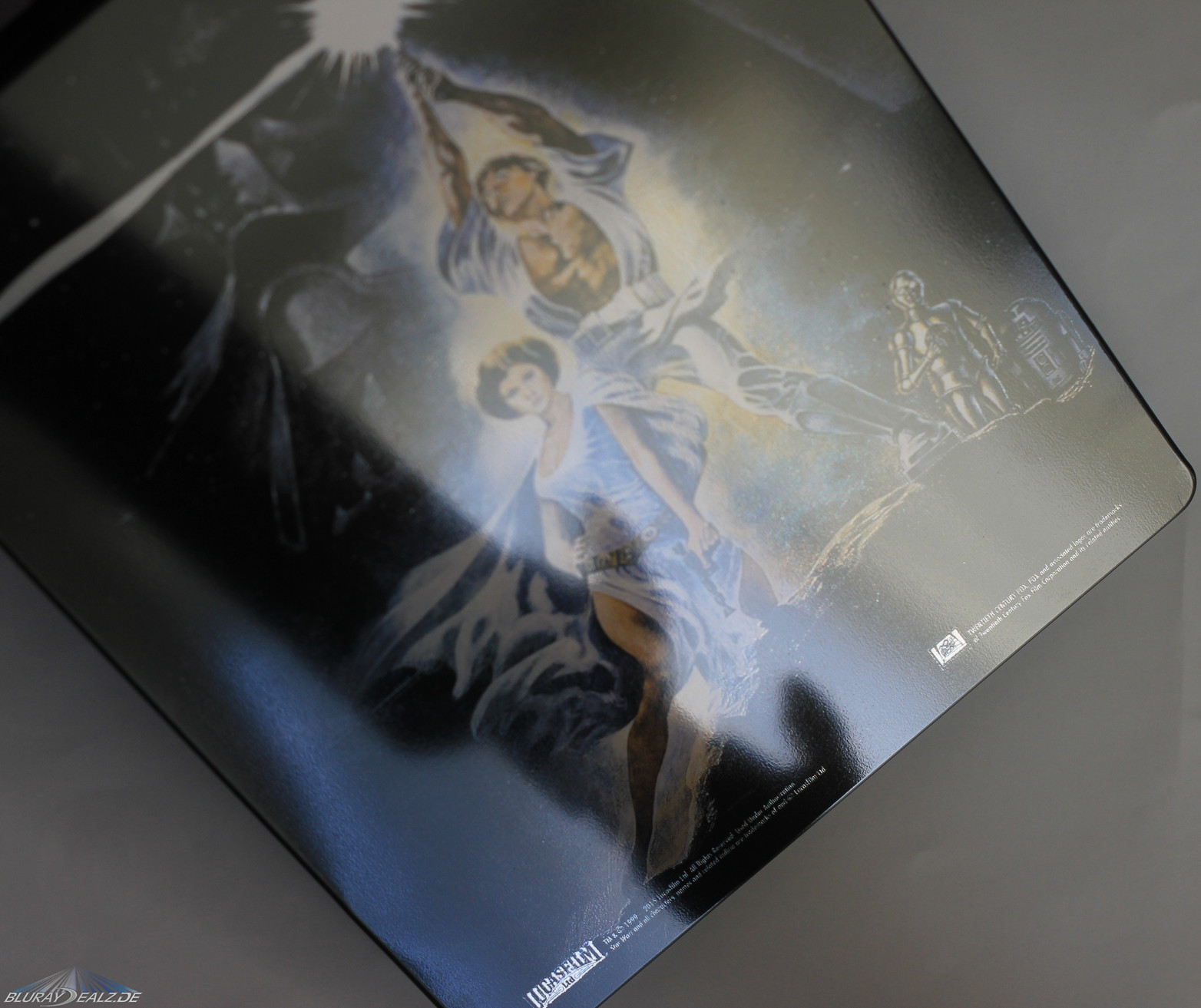 Die gesamte Front des Steelbooks weist zudem eine gewisse Schimmeroptik auf, die bestimmte Gesichts- bzw. Maskenteile je nach Lichteinfall betont und wirklich gut aussieht. Das Star Wars-Logo ist bei jedem Steelbook debossed (nach innen geprägt) und macht richtig was her.