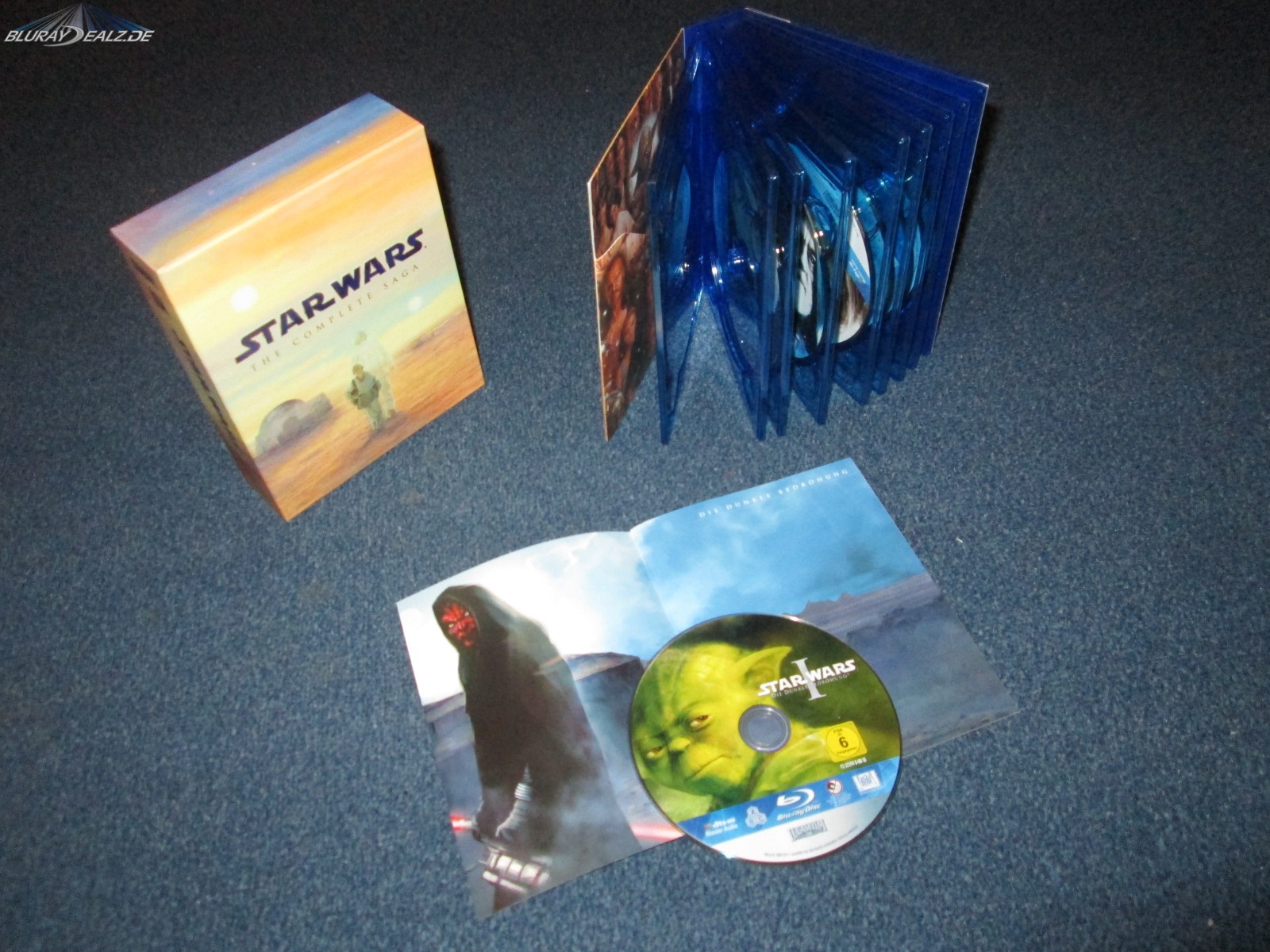 Die Complete Saga hat insgesamt neun Blu-rays: Sechs Filme, jeweils eine Bonus-Disc zur jeweiligen Trilogie und eine Extra-Disc mit Dokumentationen und Parodien.
